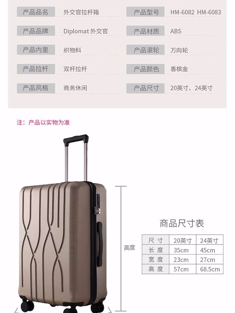 商品名称:外交官 拉杆箱 HM-6082 20英寸 香槟金
