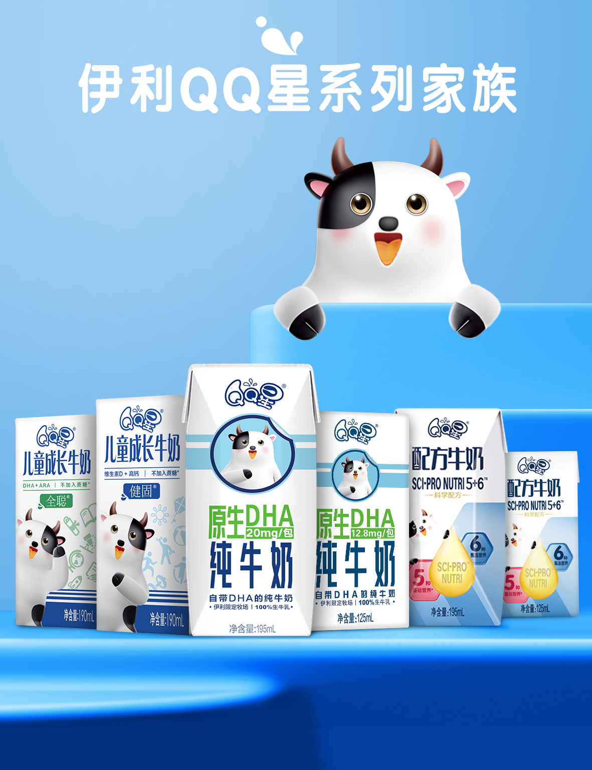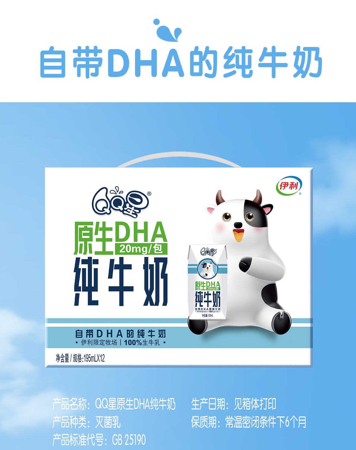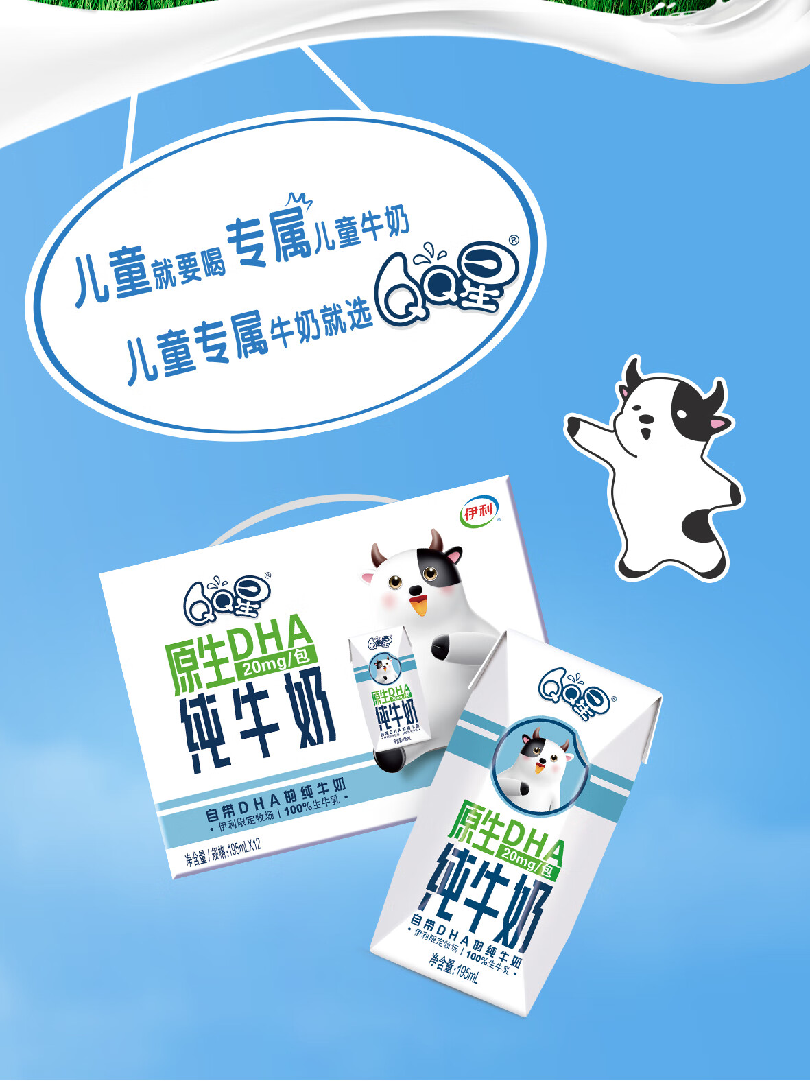 商品名称:伊利 QQ星原生DHA纯牛奶195mL*12盒/礼盒装 儿童牛奶 无添加 精选限定牧场