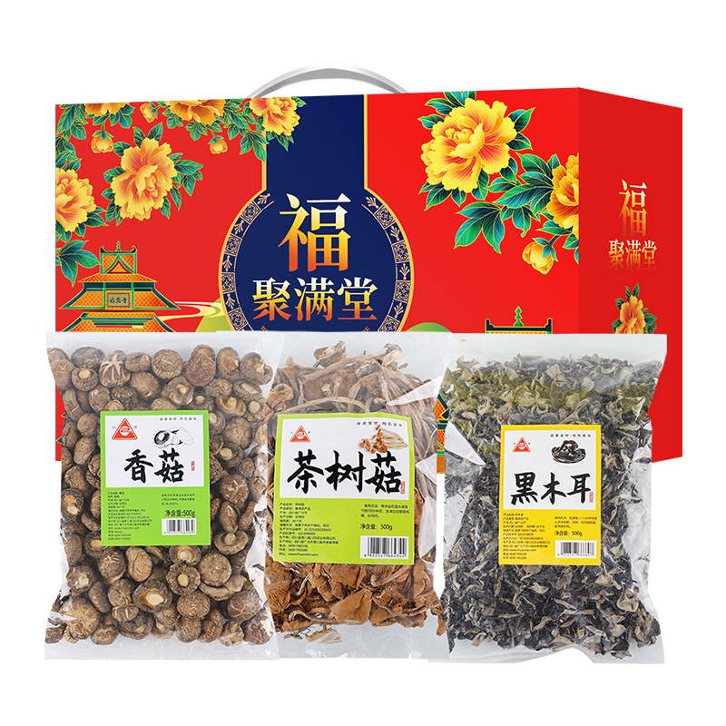 商品名称:川珍 黑木耳香菇茶树菇组合 福聚满堂礼盒1500g/盒 南北干货 炒菜凉拌 山珍菌菇煲汤食材