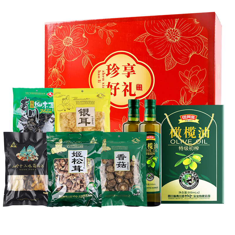 商品名称:川珍 山珍菌菇粮油组合 珍享好礼礼盒1710g/盒 橄榄油菌汤包木耳香菇银耳礼盒 食用菌火锅食材煲汤材料