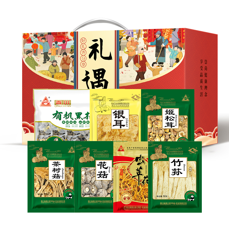 商品名称:川珍 山珍菌菇有机木耳银耳竹荪花菇虫草花姬松茸茶树菇组合礼遇特产礼遇礼盒1070g/盒山珍菌菇煲汤食材