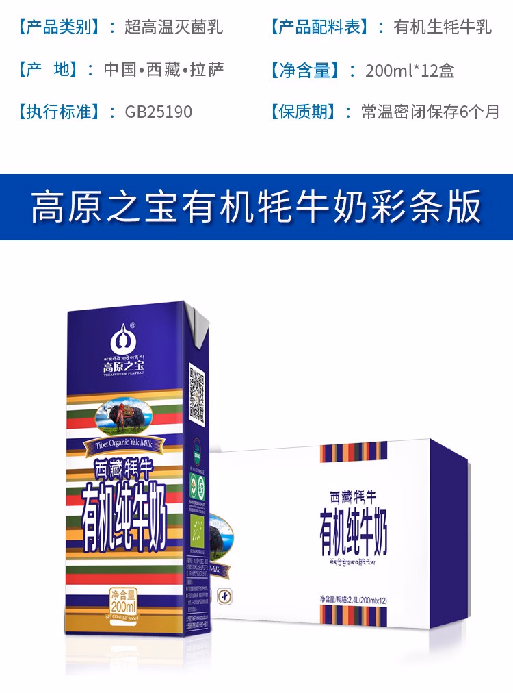 商品名称:高原之宝 有机牦牛奶(彩条装)200ml*12