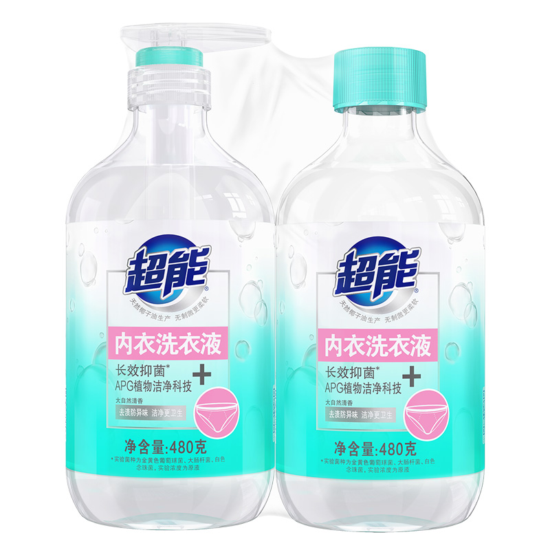 商品名称:超能 内衣洗衣液 480g*2瓶/组 长效抑菌18小时 内衣净 内衣裤专用 男女通用 生理期专用 手洗 温和易漂 单位:组