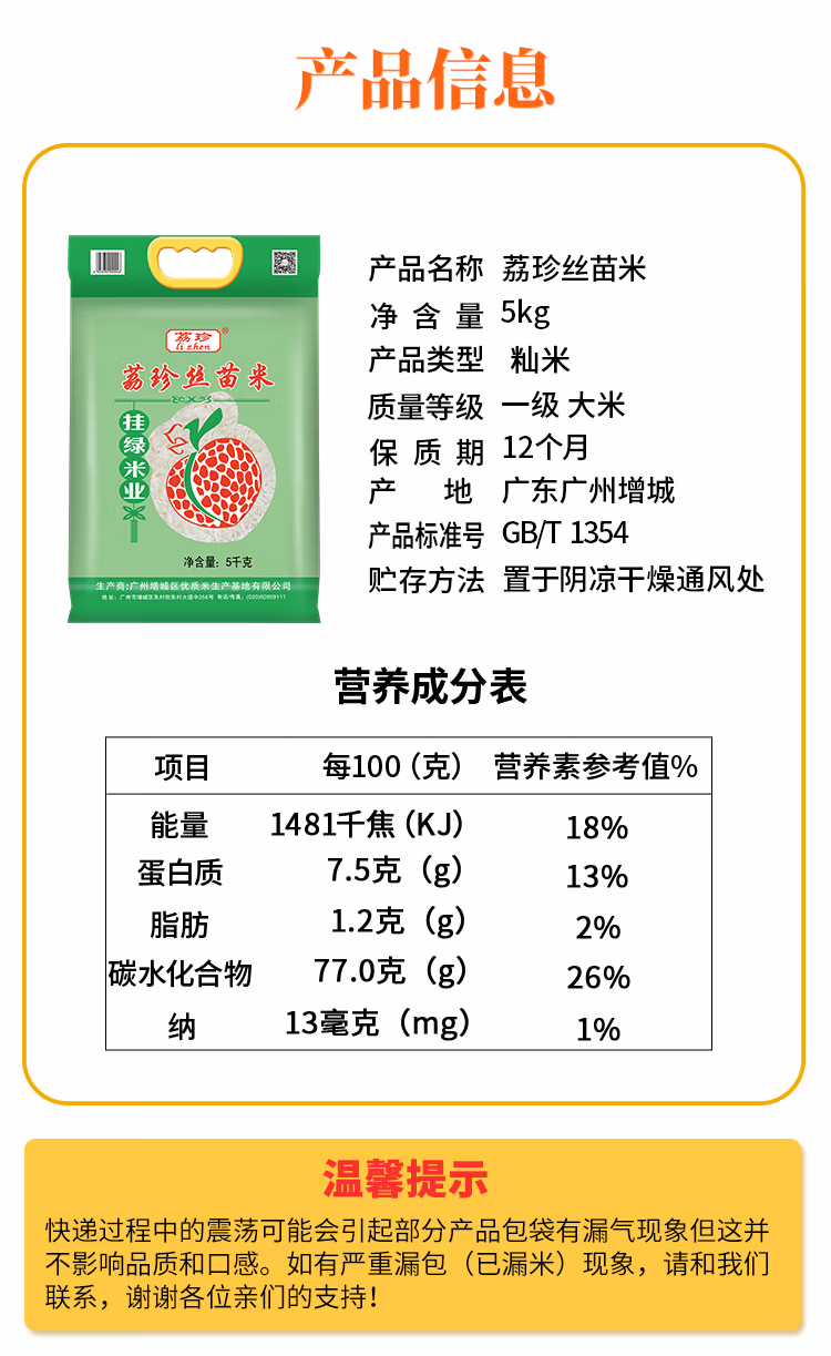 商品名称:挂绿-增城荔珍丝苗米-南方籼米-5kg-单位:包