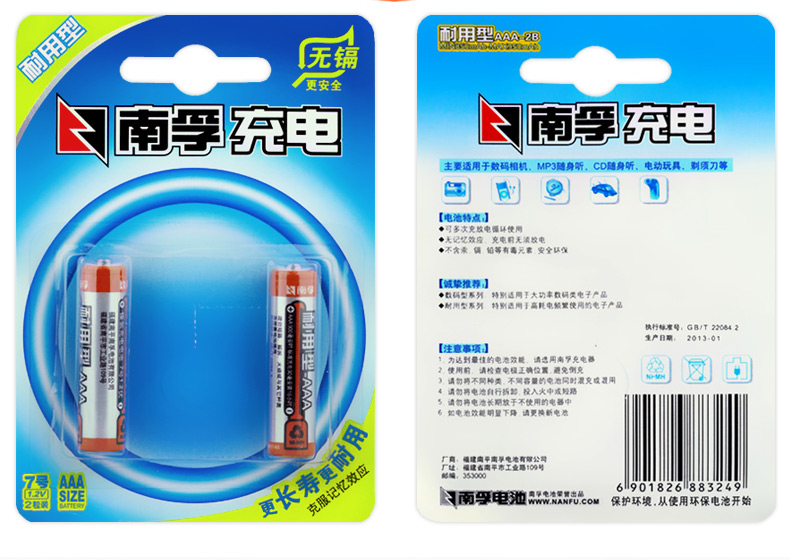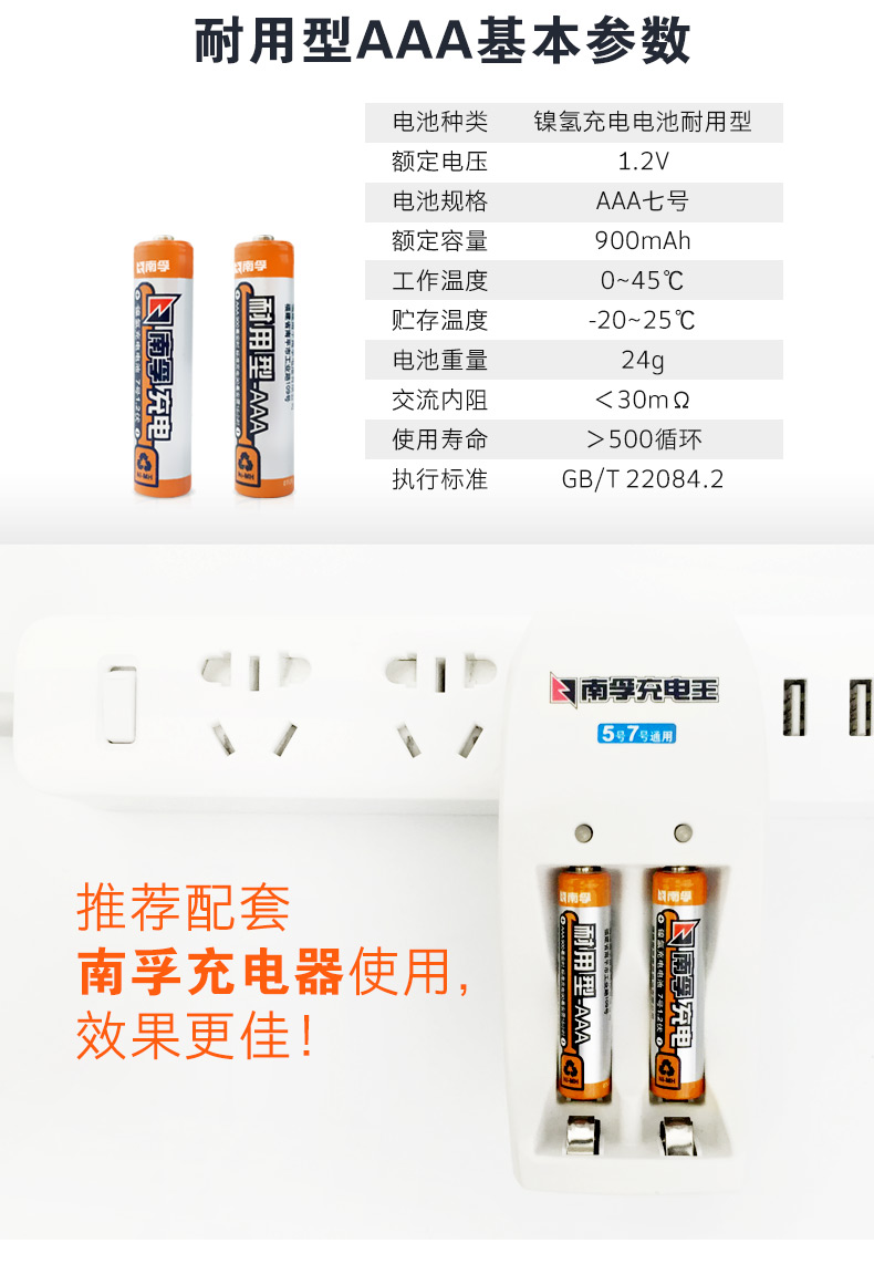 商品名称:南孚 7号充电电池1.2V七号耐用型900mAh AAA-2B