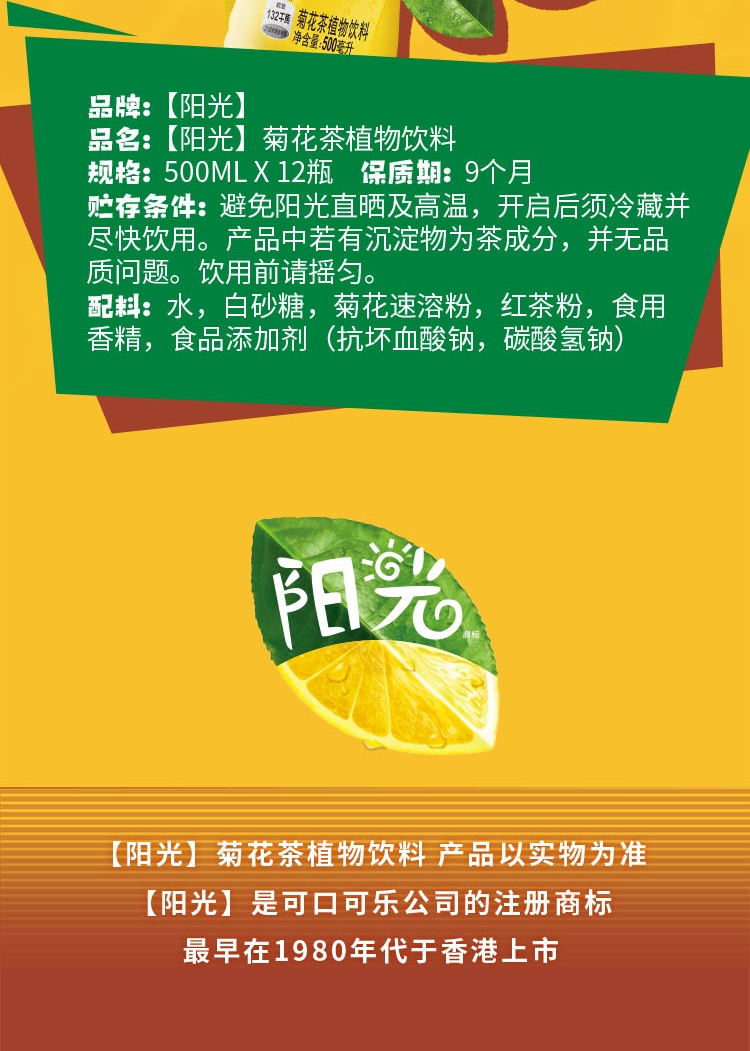 商品名称:可口可乐 Coca-Cola 阳光菊花 茶饮料 500ml*12瓶 整箱装 可口可乐出品 新老包装随机发货 单位:箱