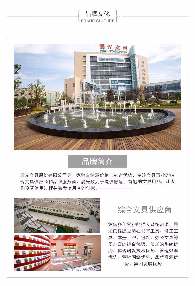 晨光(M&G)致力于整合创意价值与服务优势, 专注于综合文具产业。综合文具用品涵盖书写工具、学生文具、办公文具及其他相关产品四大领域。晨光工业园拥有全流程生产车间、模具工程、设备研发中心,通过整合包括原料、技术、资本、市场、人才和创意资源,为客户提供性价比的文具用品,让学习和工作更快乐。一切创意,发自内心,源于智慧。