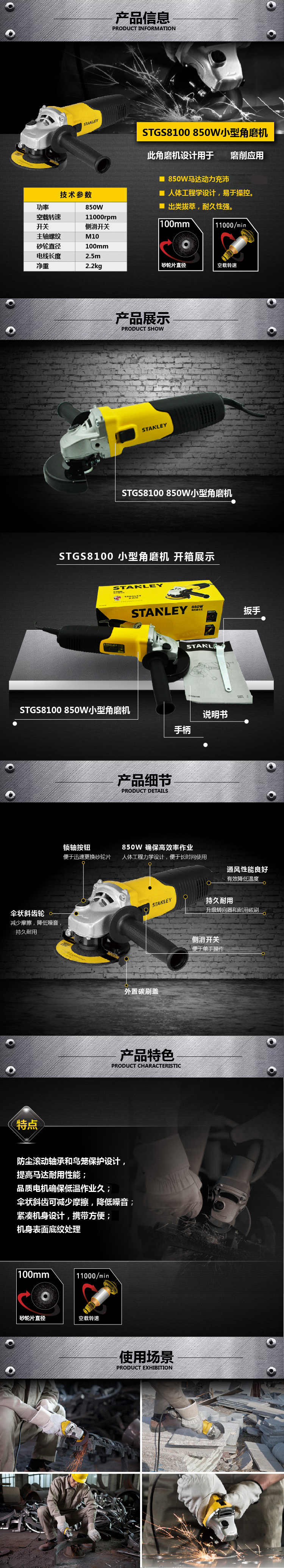 商品名称:STANLEY/史丹利角磨机100mm 850W小型角磨机(侧滑开关) STGS8100