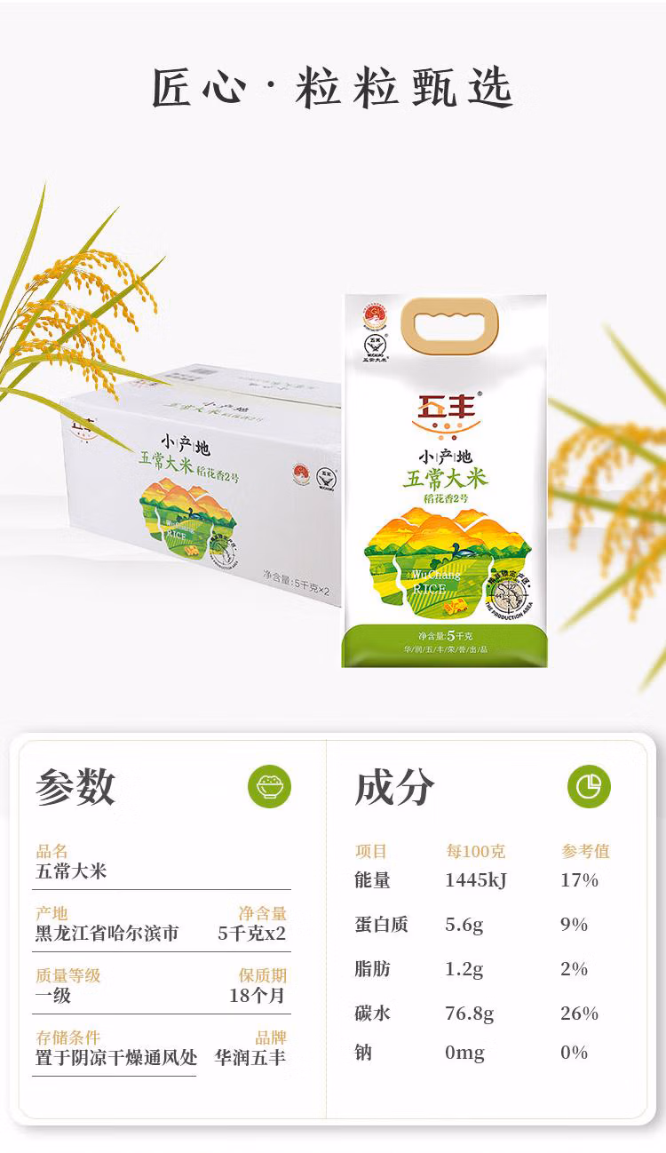 商品名称:五丰 大米 5kg*2包 20斤 东北大米 大包装 单位:组