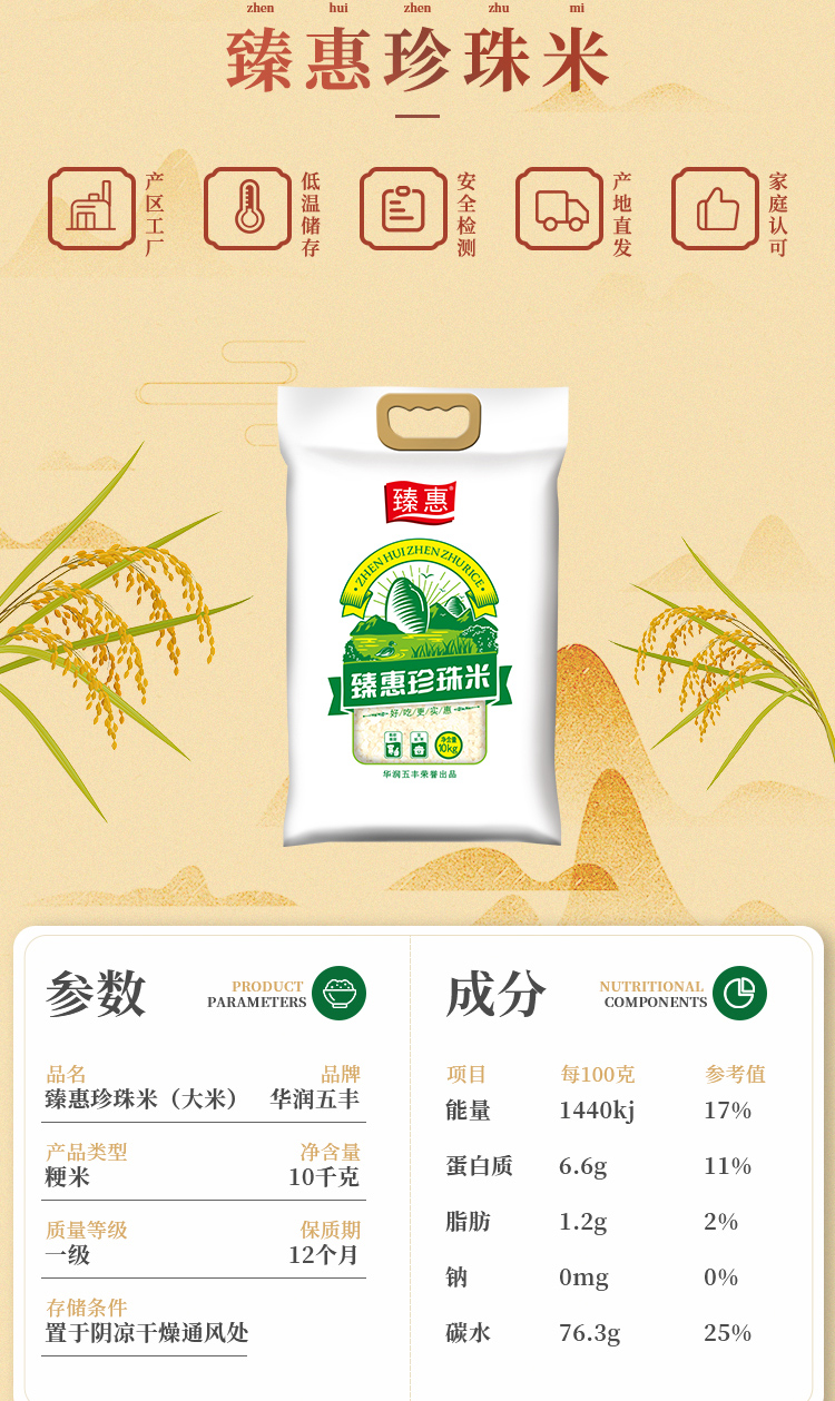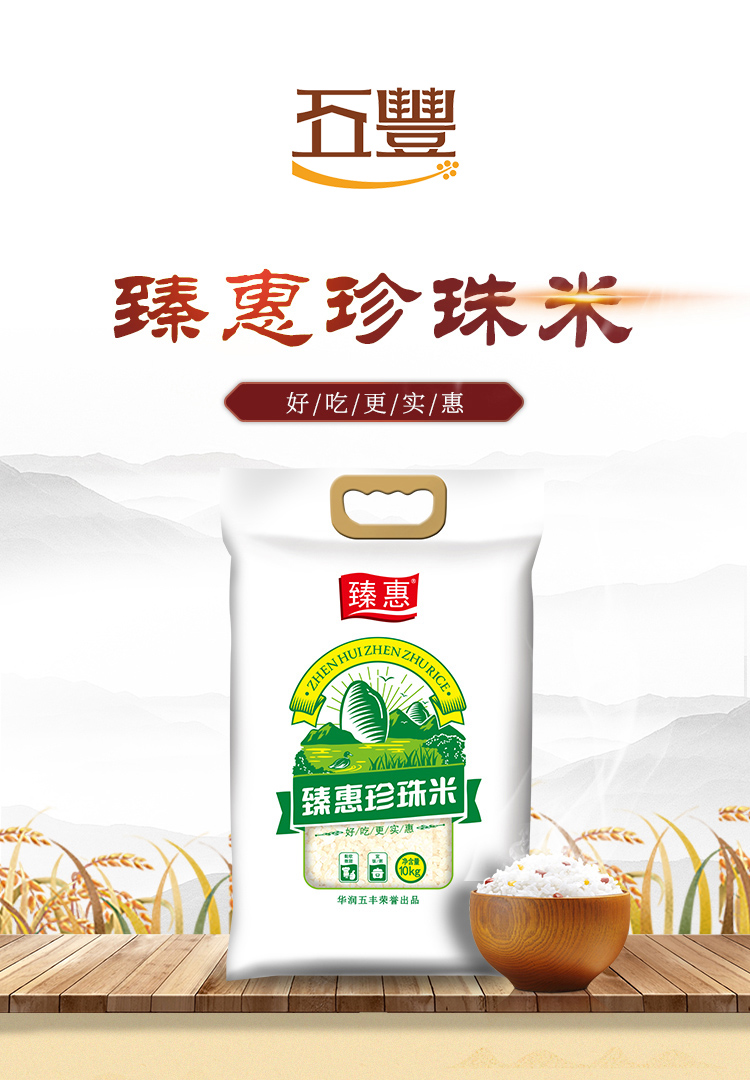 商品名称:五丰大米臻惠珍珠米10kg*1袋苏北米剔透圆润饭粥皆宜软糯可口
