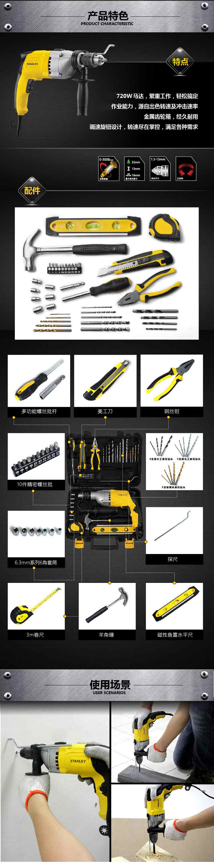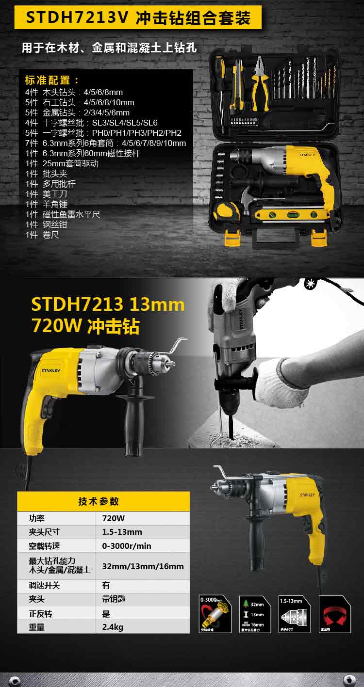 商品名称:STANLEY/史丹利电钻冲击钻两用720w家用电动工具套装 STDH7213V