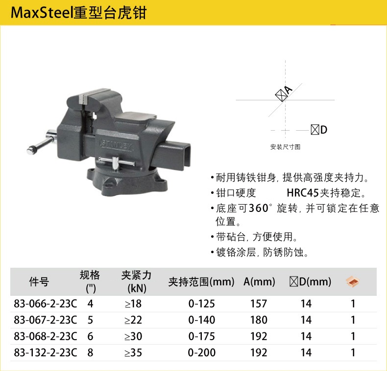 商品名称:STANLEY/史丹利 MaxSteel重型台虎钳 铸铁桌虎钳五金夹持工具 83-066-2-23C