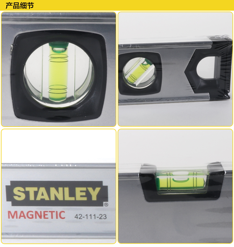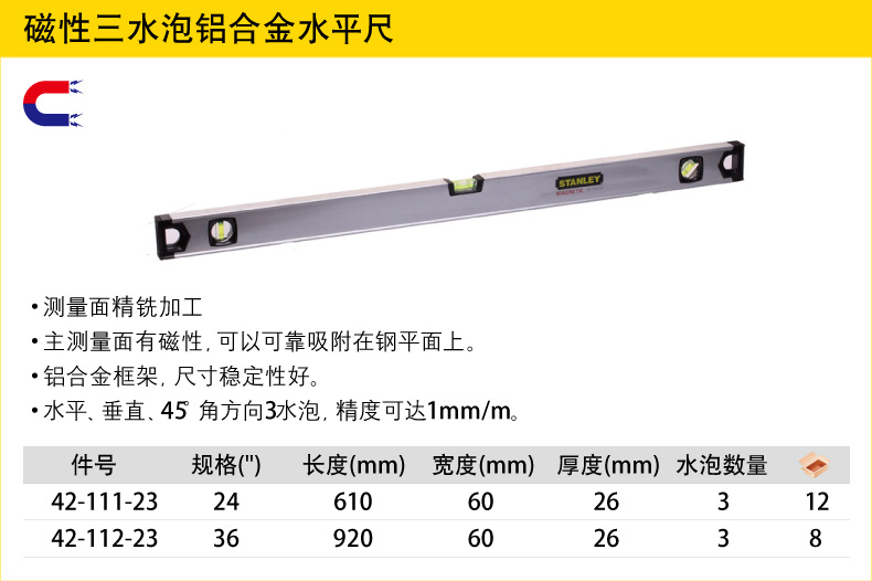 商品名称:STANLEY/史丹利 磁性三水泡铝合金水平尺 高精度测量 42-111/112