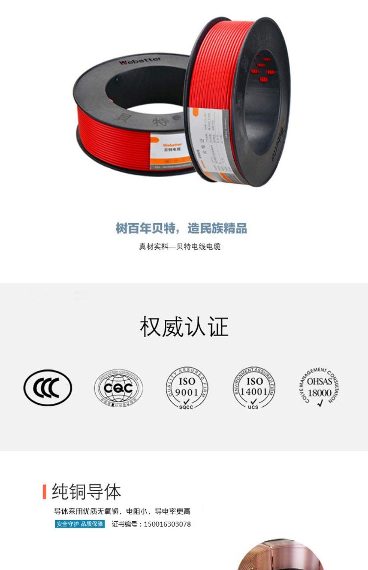 商品名称:Webetter/贝特 BV4平方国标铜芯家装空调电线单芯单股100米硬线