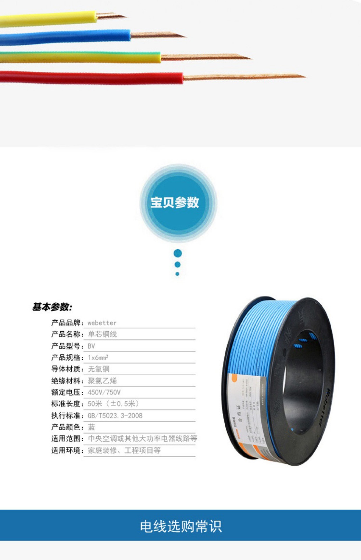 商品名称:Webetter/贝特 电线电缆单芯线 家装硬线 BV1.5 2.5 4 6平方铜芯国标铜100米