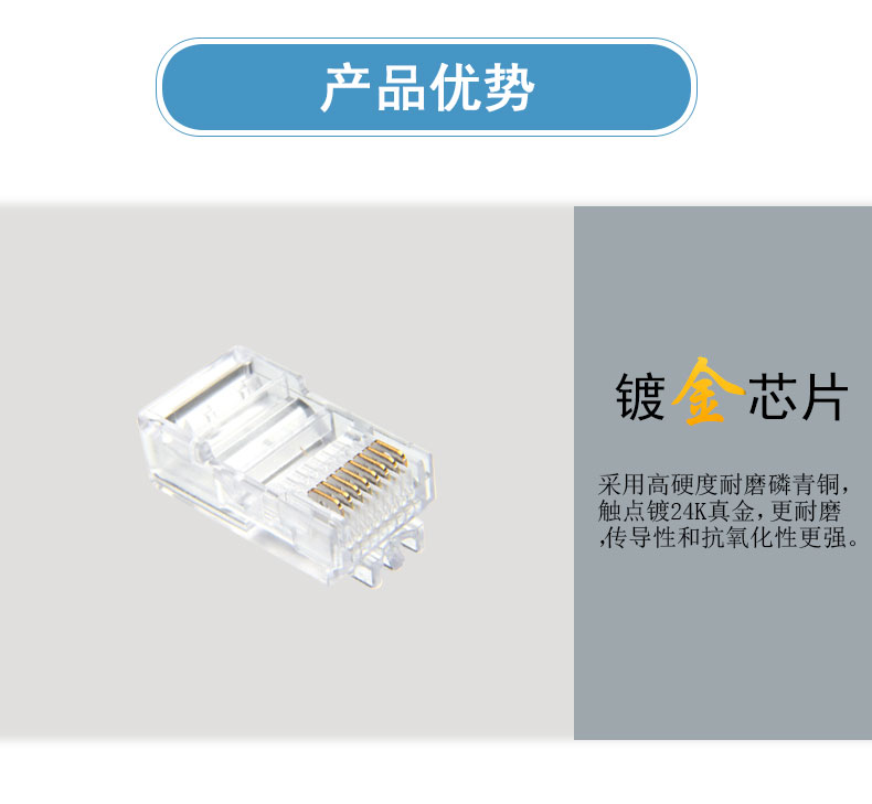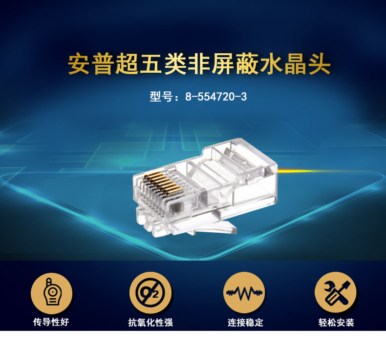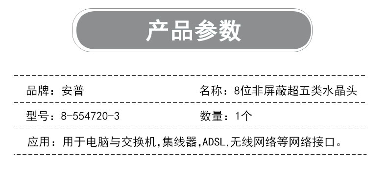 商品名称:AMP/安普 超五类网络水晶头RJ45非屏蔽网线8芯8-554720-3