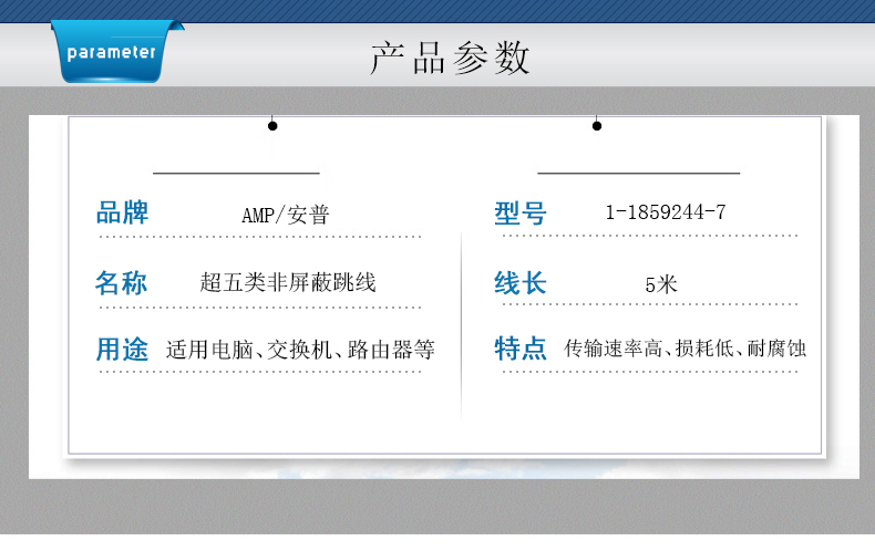 商品名称:AMP/安普 8八芯 超五类非屏蔽网线 5米跳线1-1859244-7