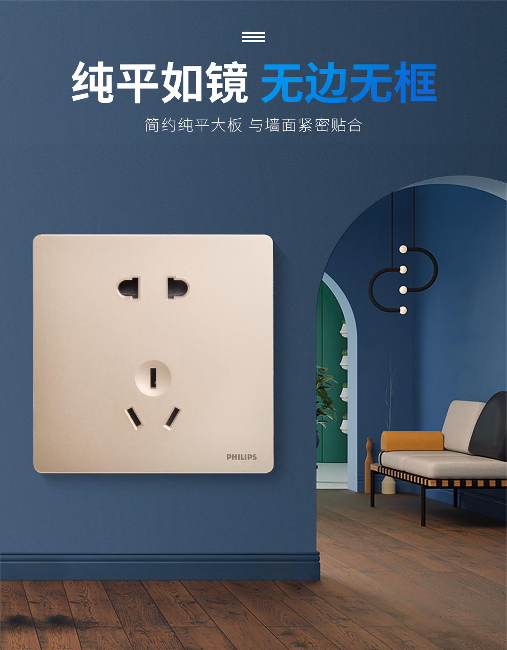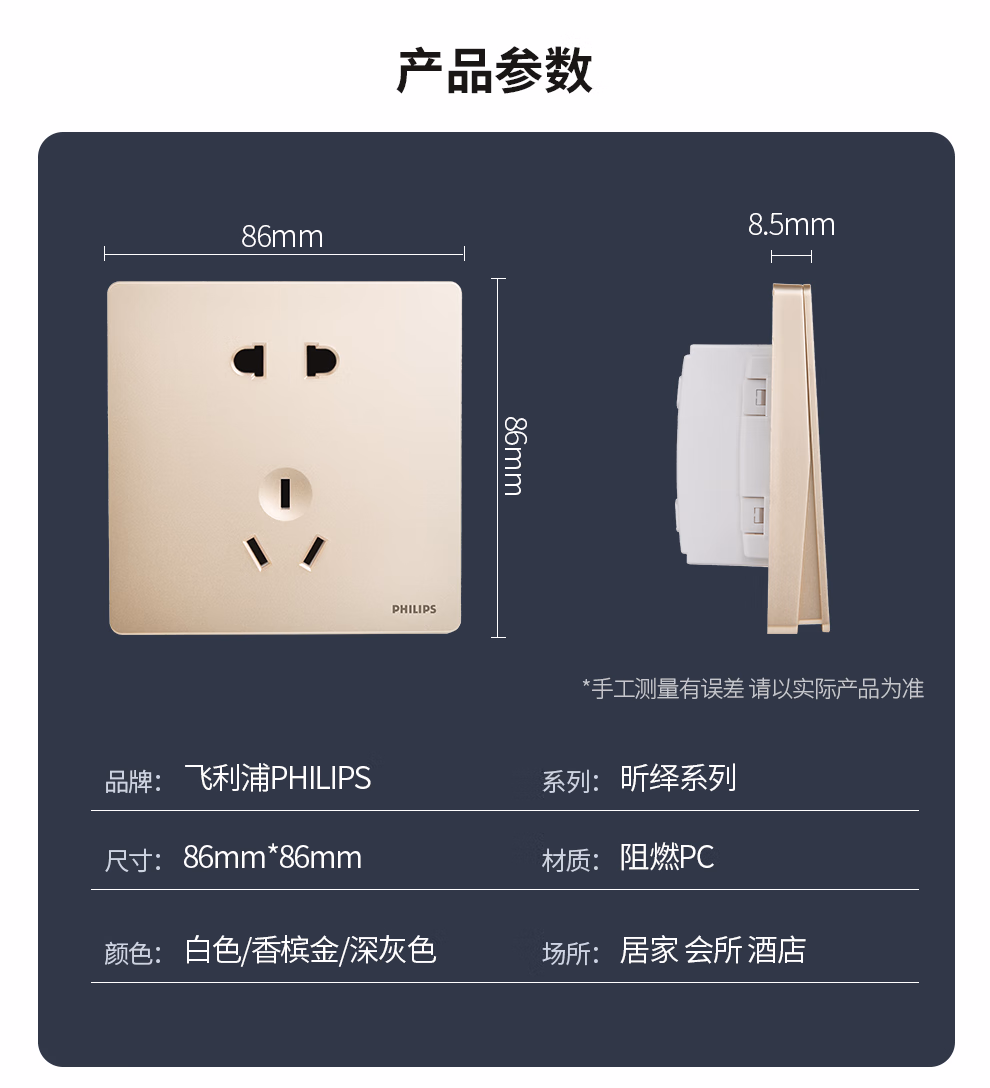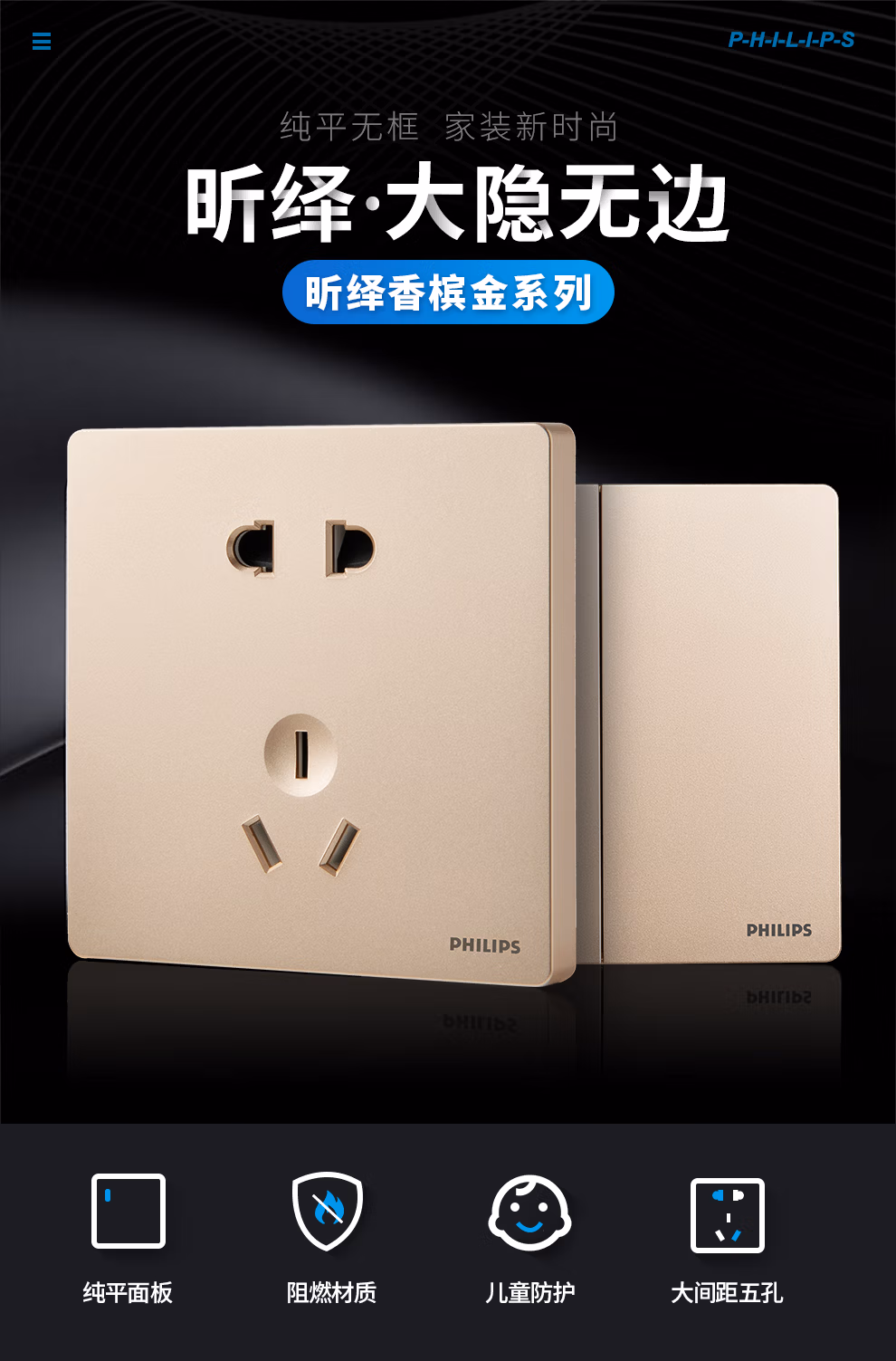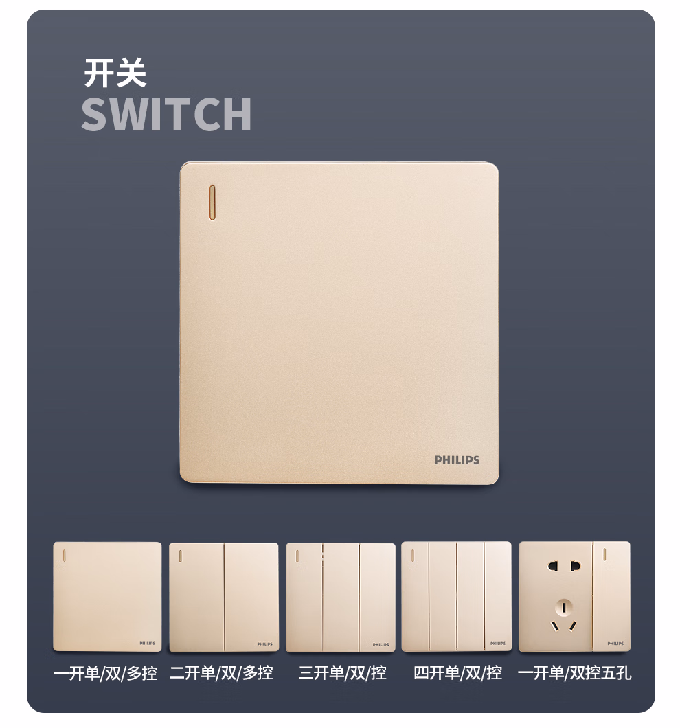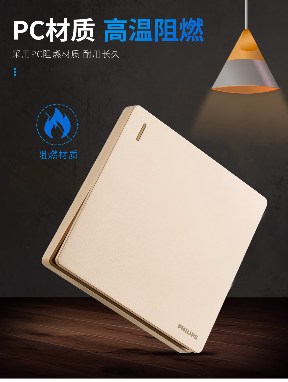 商品名称:飞利浦(PHILIPS) 开关插座面板昕绎香槟金色86型暗装家用墙壁五孔插座带一开开关 五孔插座(10A)10只