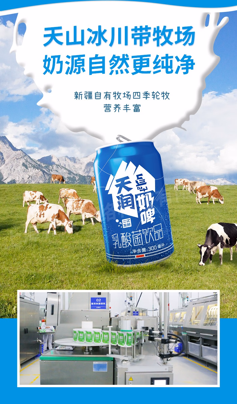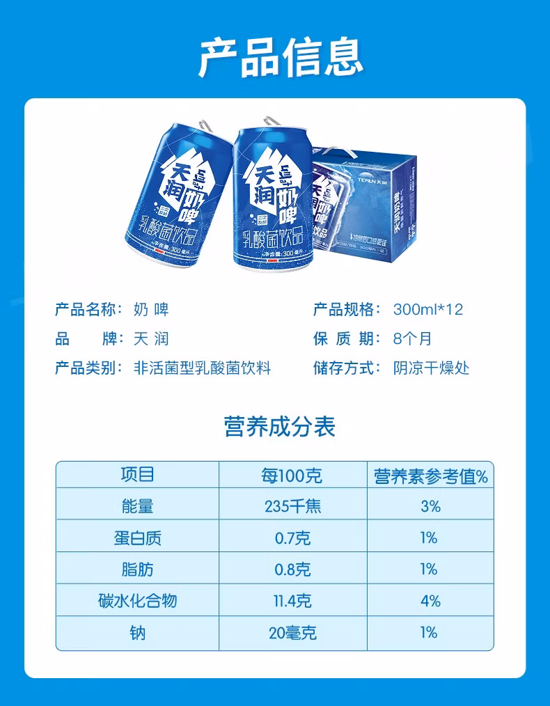 商品名称:天润(terun) 新疆天润奶啤整箱 牛奶二次发酵乳酸菌含乳饮品 风味乳饮料 天润蓝罐奶啤300ml*12罐 单位:箱