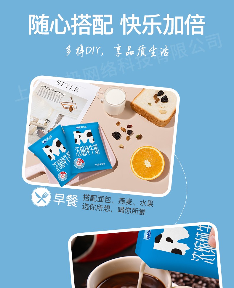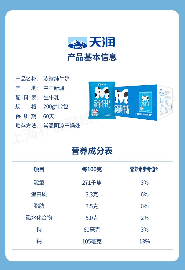 商品名称:天润(terun)新疆天润浓缩纯牛奶M枕 常温早餐奶全脂牛奶袋装整箱 200g*12袋 单位:箱