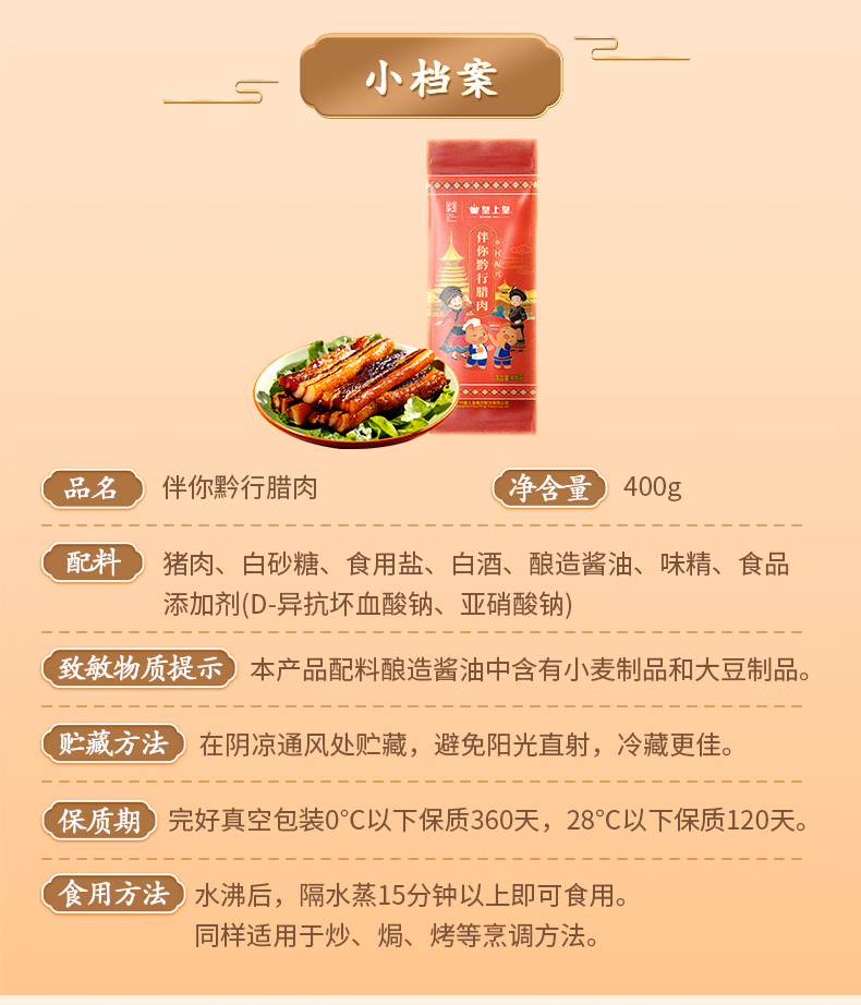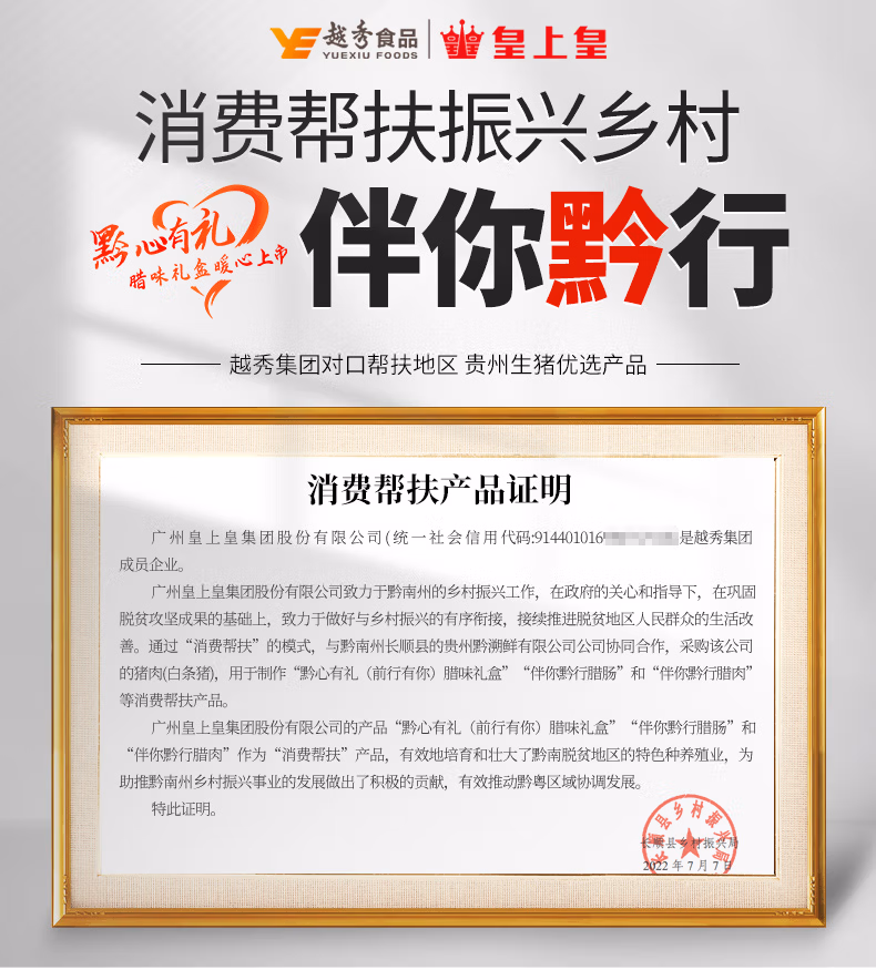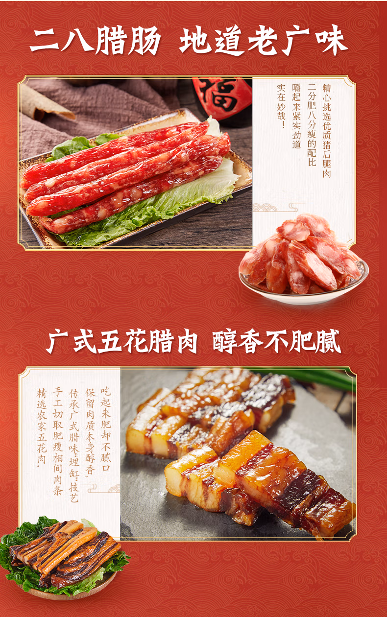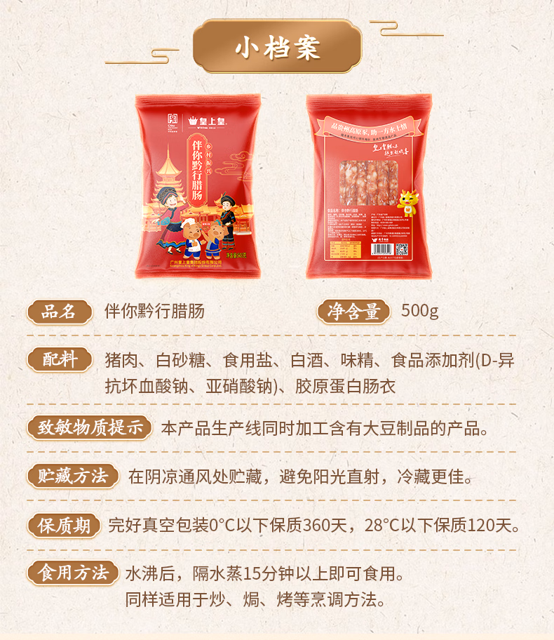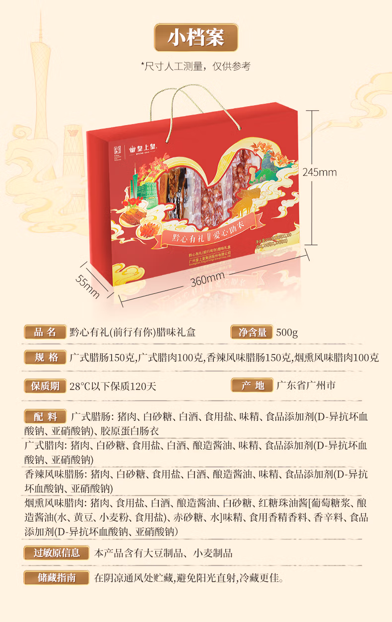 商品名称:皇上皇中华老字号广式腊肠腊味土特产咸甜团购礼盒福利贵州乡村振兴助农 (前行有你)腊味礼盒500g