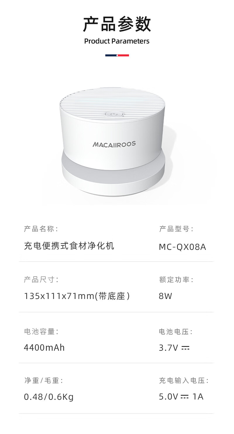 商品名称:迈卡罗 果蔬清洗机 家用洗菜机 蔬果净化器消毒食材净化消毒器 MC-QX08A