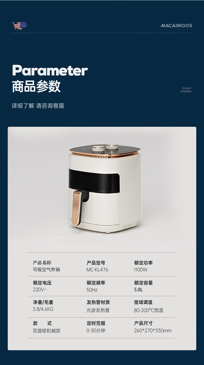 商品名称:迈卡罗 空气炸锅 无油烟电炸锅家用多功能大功率 大容量 烤箱薯条机 MC-KL476
