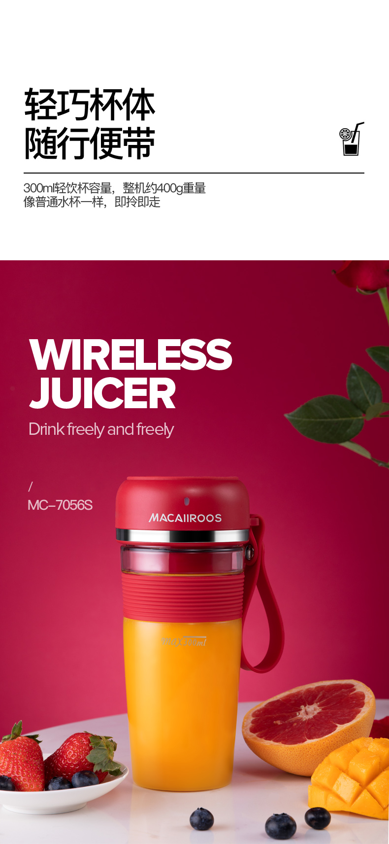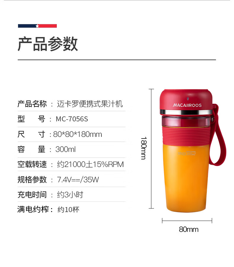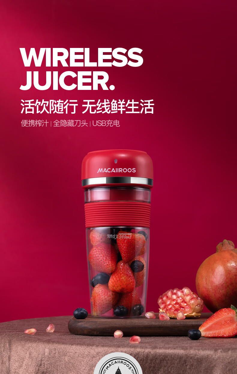 商品名称:迈卡罗 (MACAIIROOS)榨汁机迷你便携式榨汁杯家用电动小型炸果汁机网红无线随身行充电鲜榨 MC-GZ301