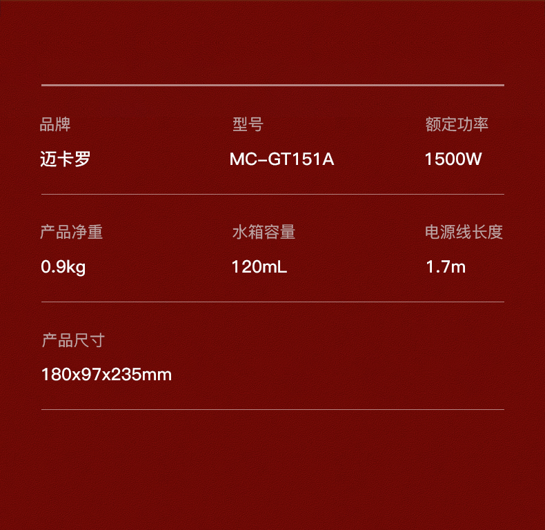 商品名称:迈卡罗 (MACAIIROOS)手持挂烫机家用电烫斗蒸汽熨烫机便携式烫衣机小型迷你衣服电熨斗 MC-GT151A