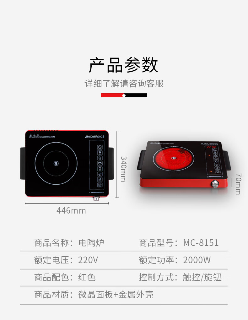 商品名称:迈卡罗(MACAIIROOS)电陶炉家用红外光波电磁炉多功能台式大功率爆炒烧烤火锅炉茶炉 MC-8151