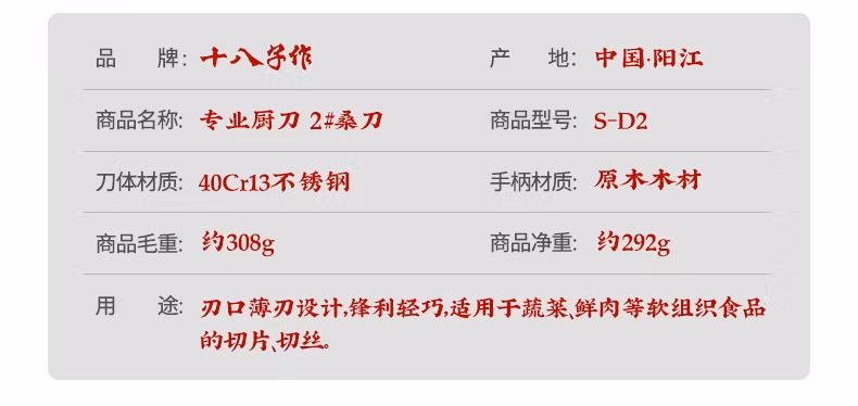 商品名称:十八子作切菜刀厨房刀具菜刀手工锻打刀桑刀厨师切片阳江十八子刀菜刀S-D2 单位:把