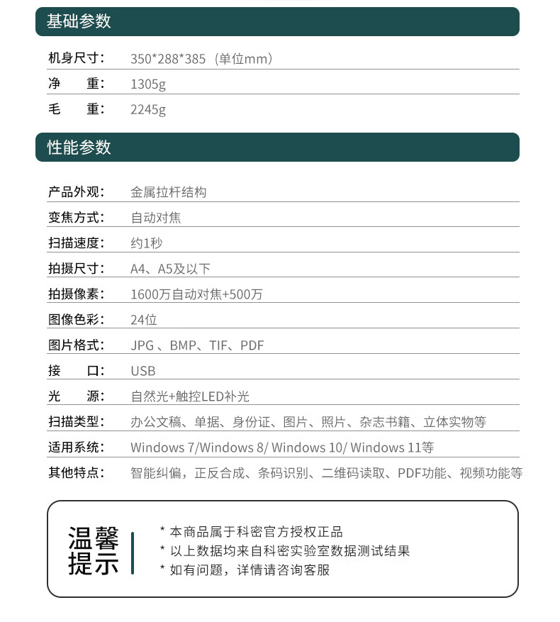 商品名称:科密 D4412 高拍仪 1600万+500万双摄A4扫描仪 OCR办公资料文件图片编辑优化 支持二次开发定制 单位:台