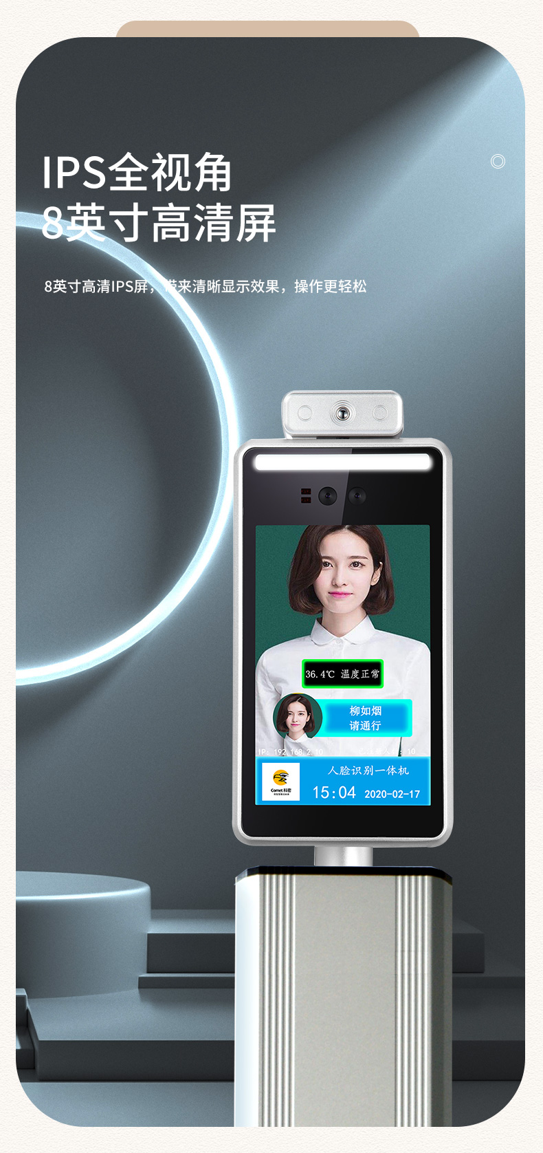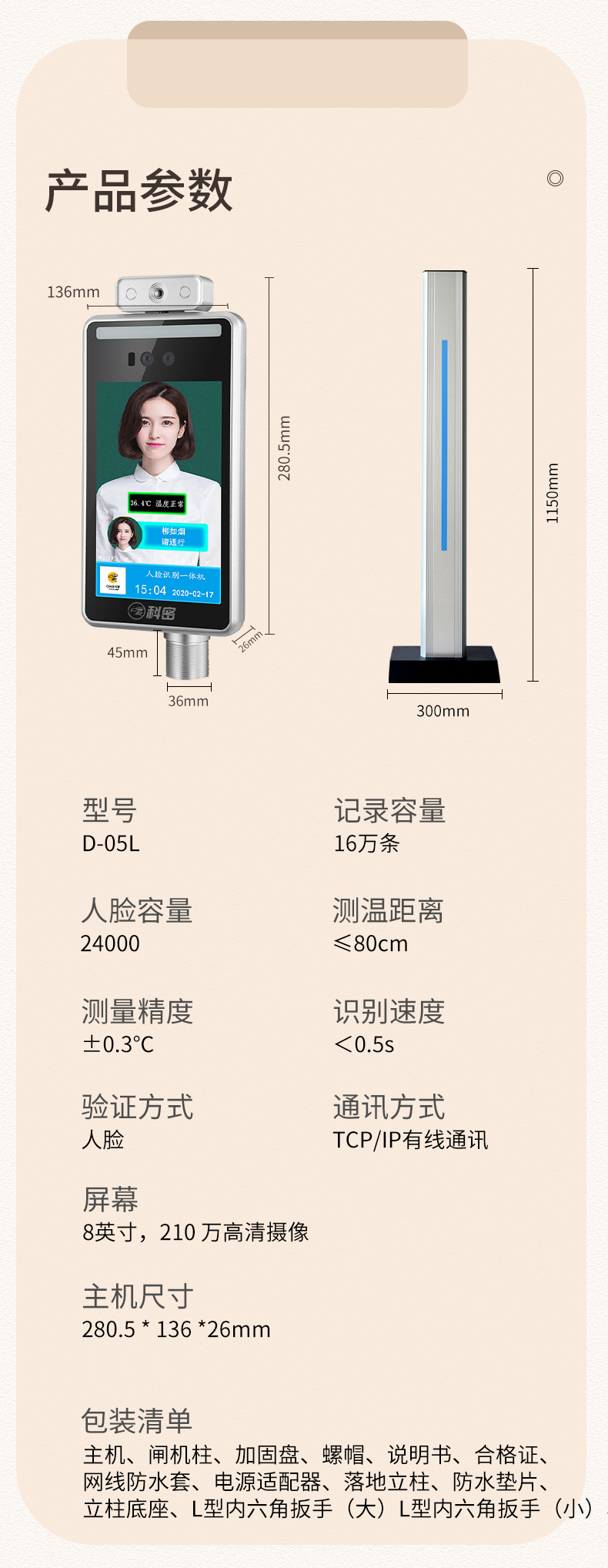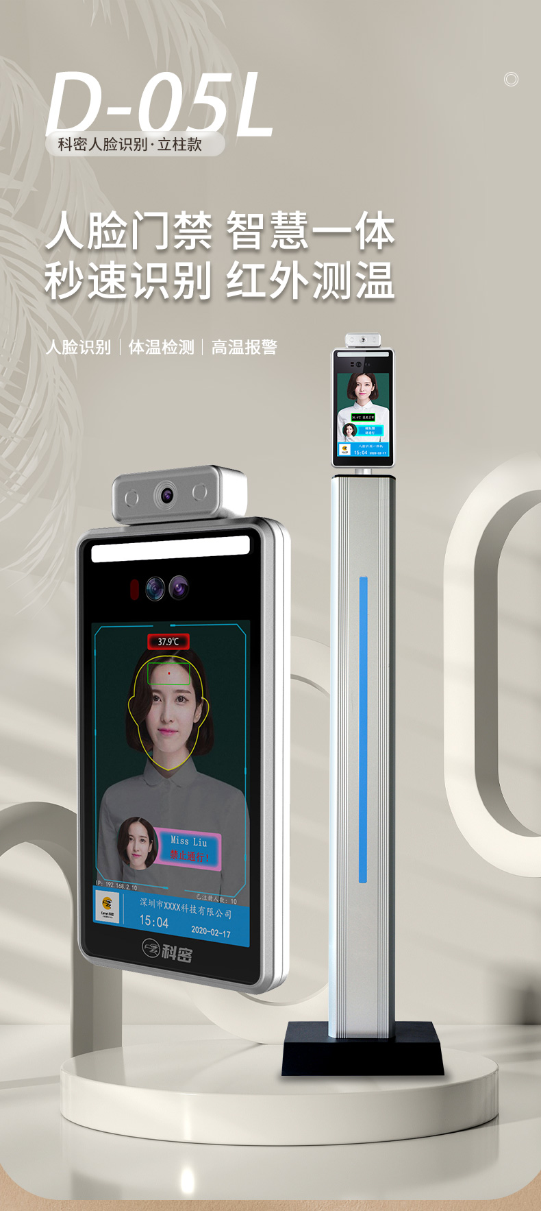 商品名称:科密 D-05L 人脸测温仪 8英寸屏人脸识别测温门禁考勤一体机 商场车站测温系统门禁机 立柱款 可定制 单位:台