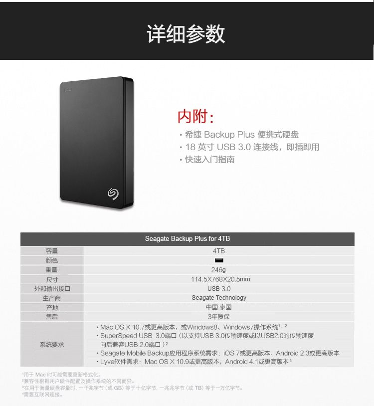 商品名称:Seagate/希捷 2.5英寸 Backup Plus 新睿品 4TB移动硬盘 STDR4000
