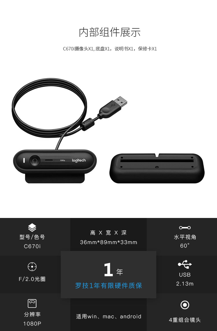 商品名称:罗技/Logitech 商务会议家用高清视频摄像头1080P主播直播电脑台式 C670i C525