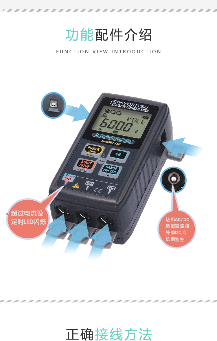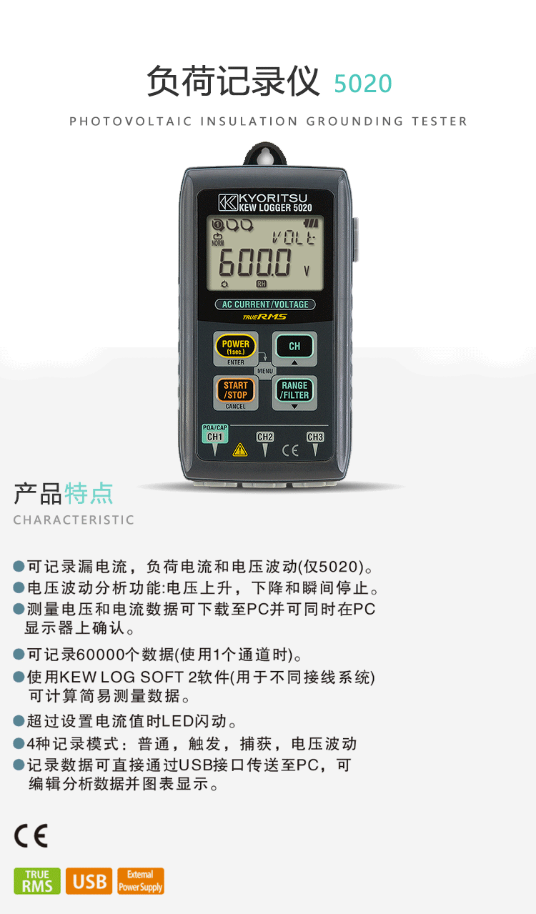 商品名称:日本共立KYORITSU/克列茨5020负荷记录仪(相电流/电压/泄漏电流/电能质量分析) 5020(主机)单位:台