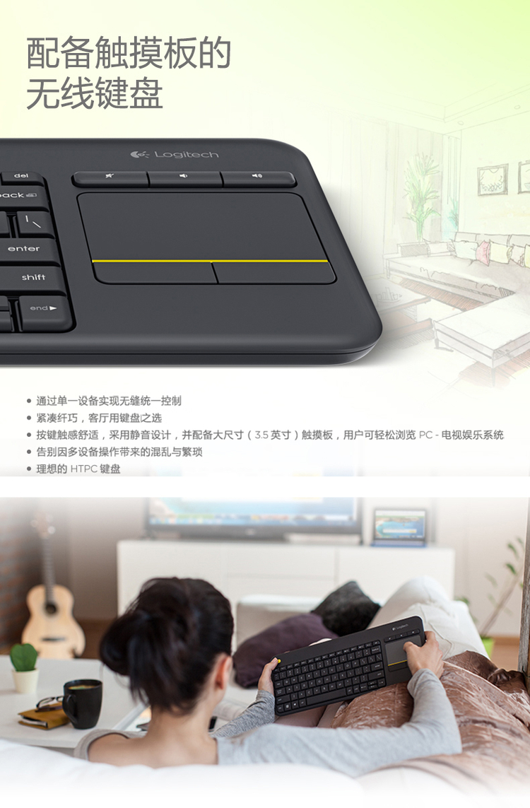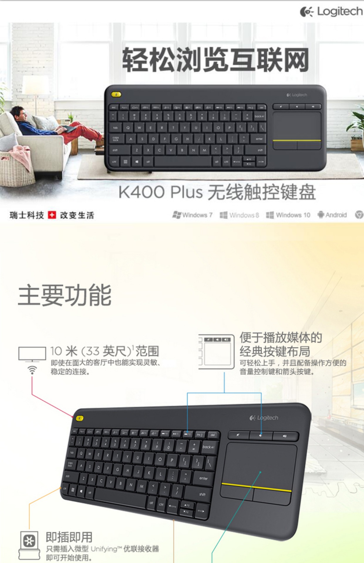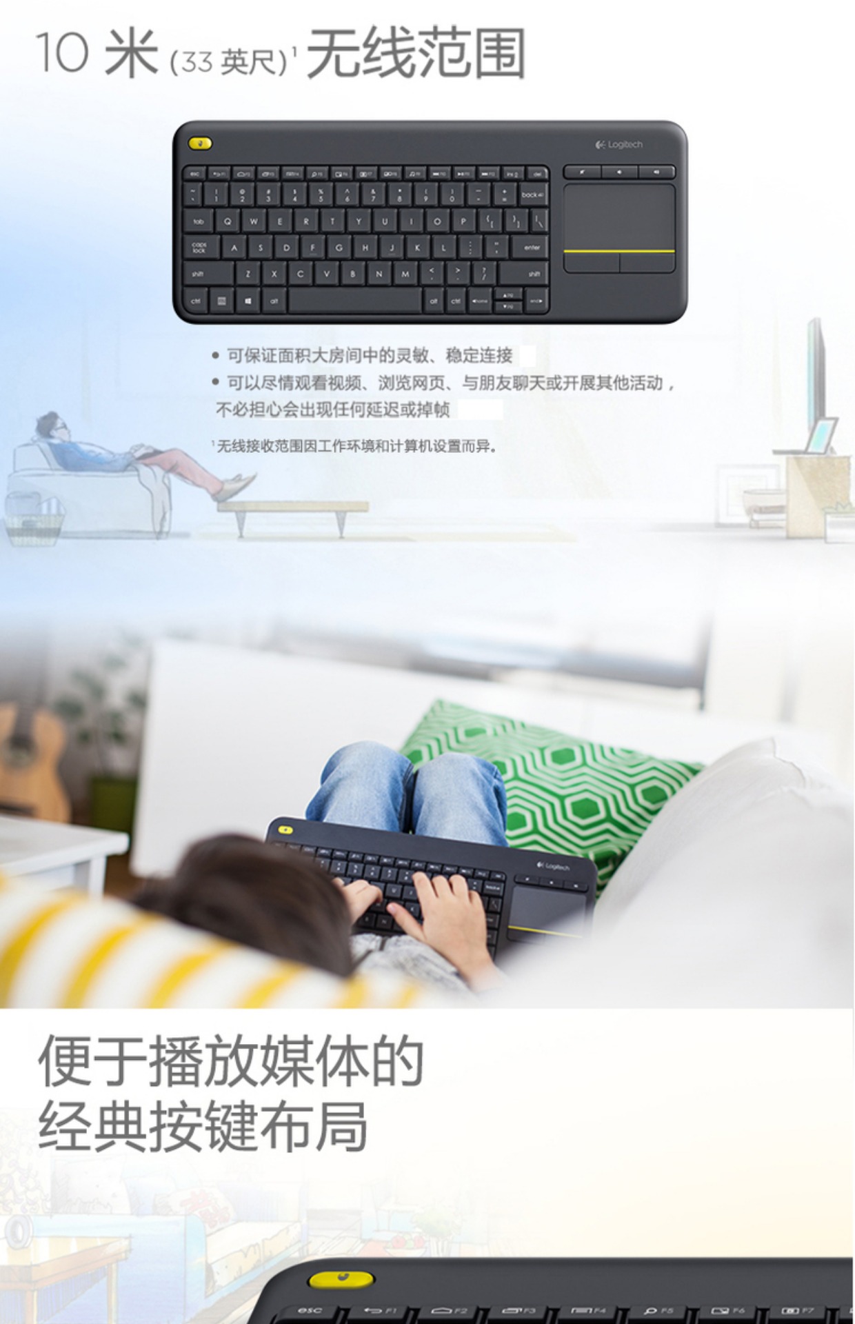 商品名称:罗技/Logitech 安卓智能电视专用电脑触摸面板无线触控键盘 K400 Plus