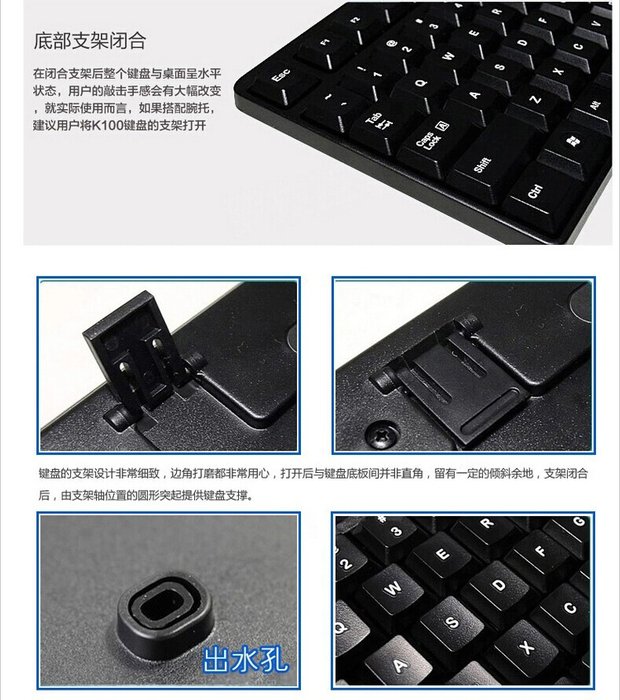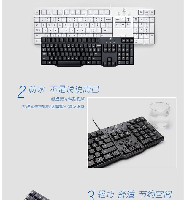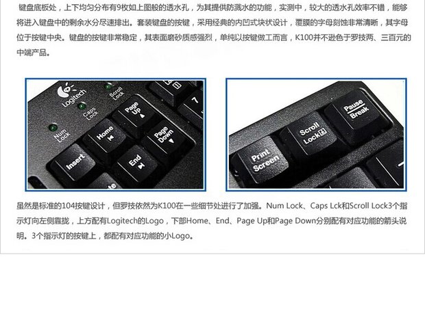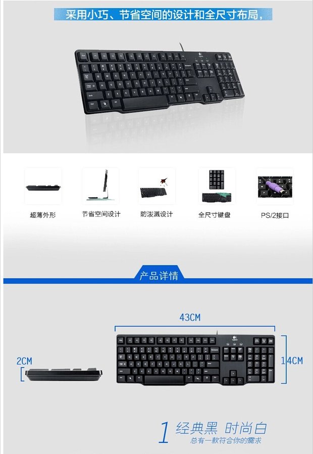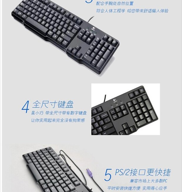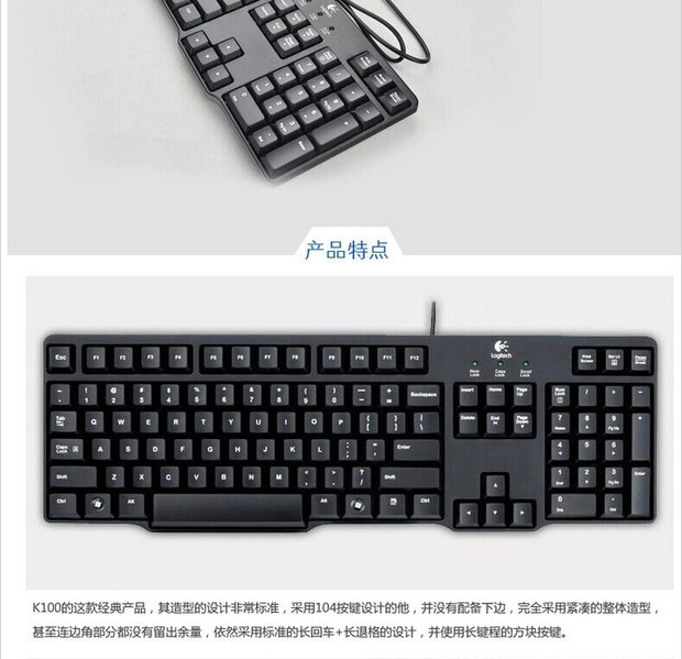 商品名称:罗技/Logitech 有线键盘PS2圆口家用办公电脑台式USB外接防水超薄 K100