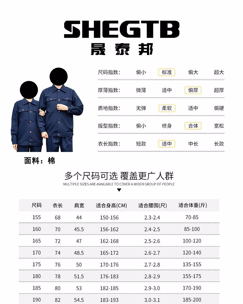 商品名称:晟泰邦 工作服套装男棉劳保服 (多色可选 S-4XL码 下单备注 ) 单位:套