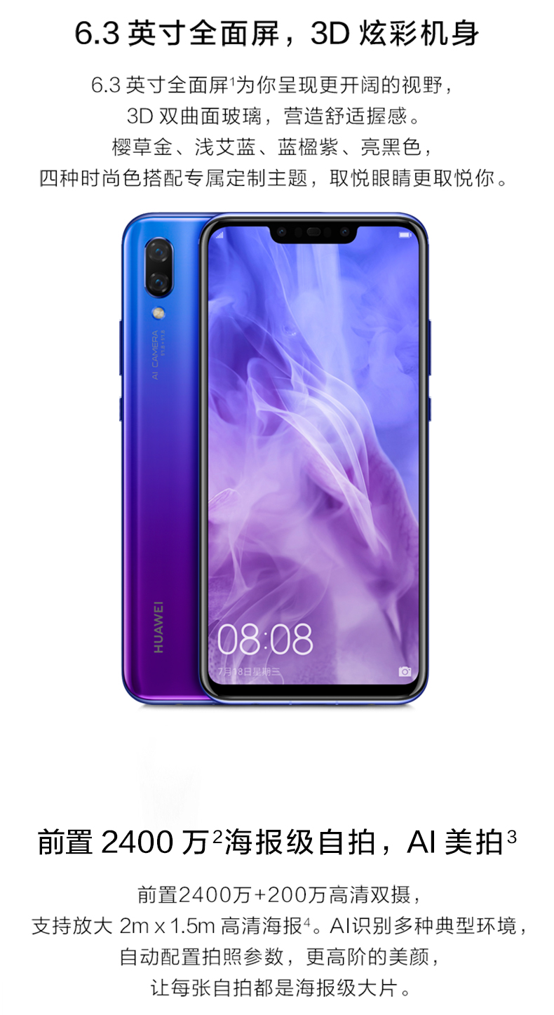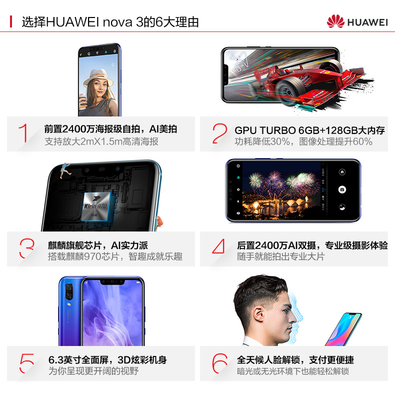 商品名称:华为/Huawei nova 3 全面屏高清四摄美颜自拍智能千玺代言游戏手机GPU TURBO