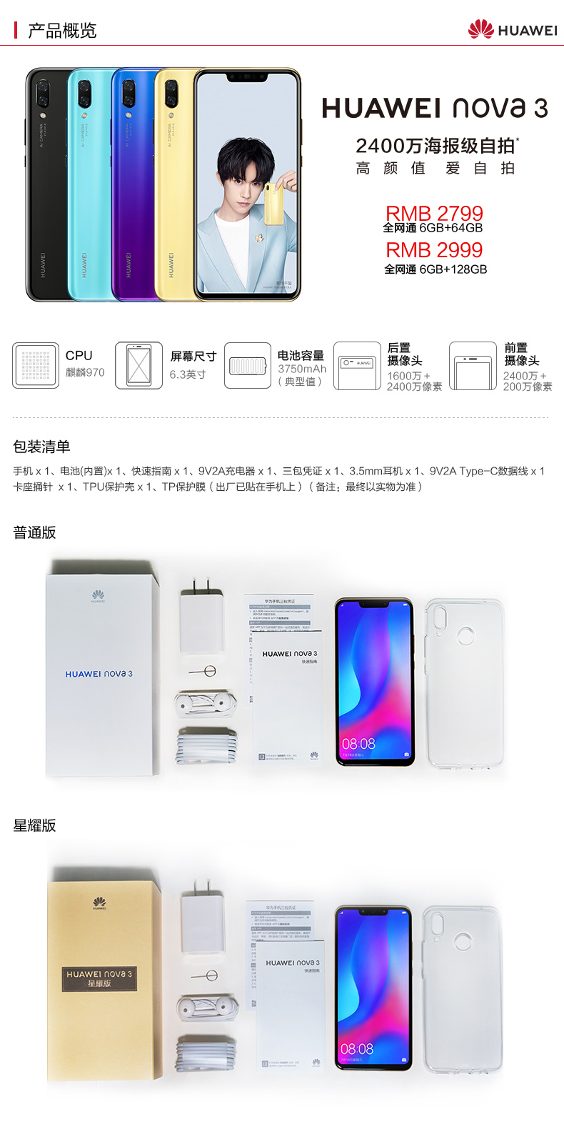 华为/Huawei nova 3 全面屏高清四摄美颜自拍智能千玺代言游戏手机GPU TURBO