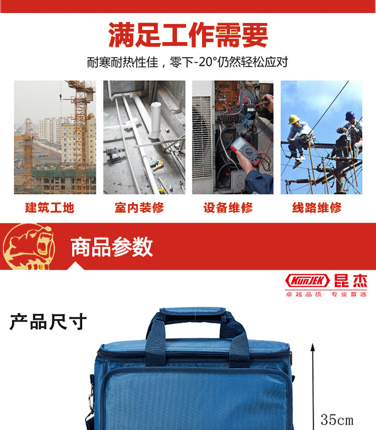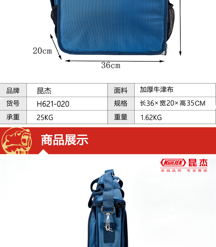 商品名称:昆杰 KUNJEK 多功能五金维修包便携式板式斜挎工具包 H621-020 单位:个