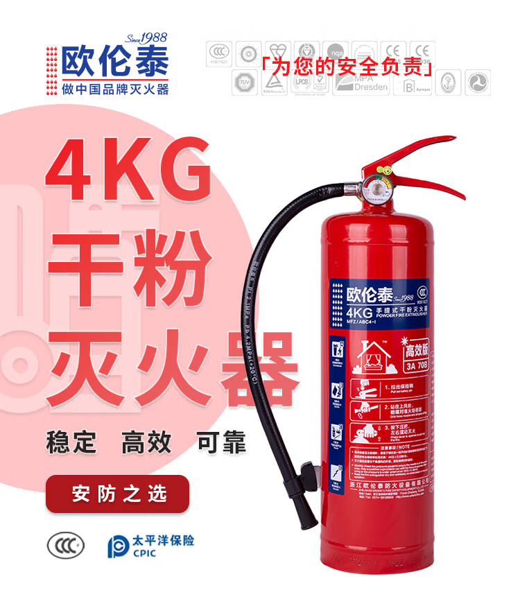 商品名称:欧伦泰 灭火器 车载车用家用商铺用 工厂仓库用大货车用 4KG手提式干粉灭火器 消防器材 MFZ/ABC4-I 单位:具