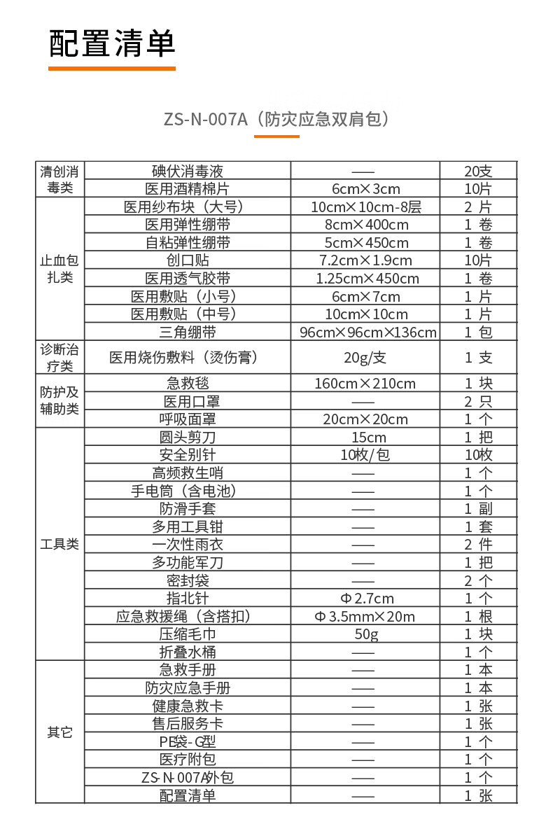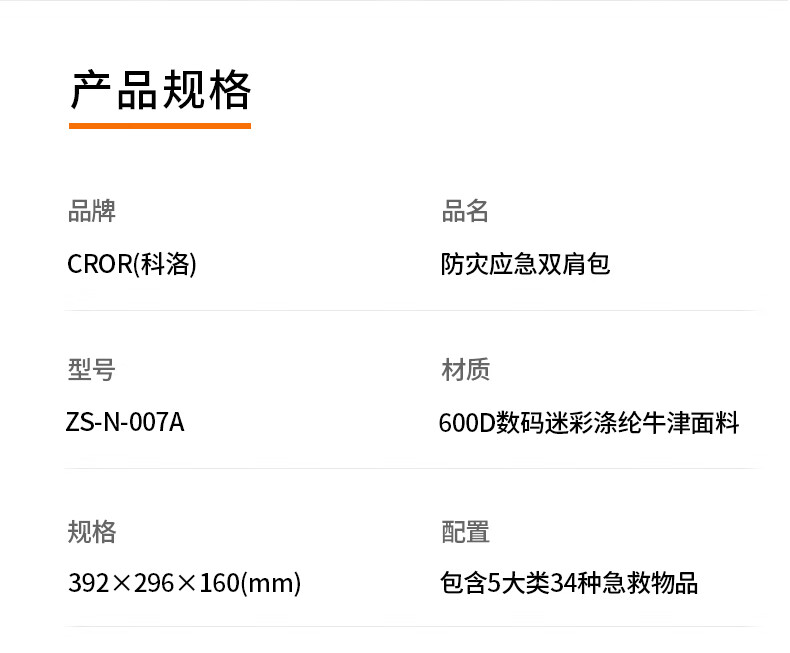商品名称:科洛(CROR)ZS-N-007A 防灾救援急救包双肩应急包套装 户外旅行野外作业场所急救包 单位:个