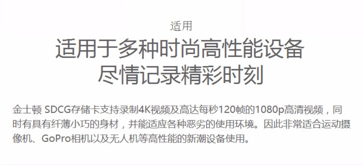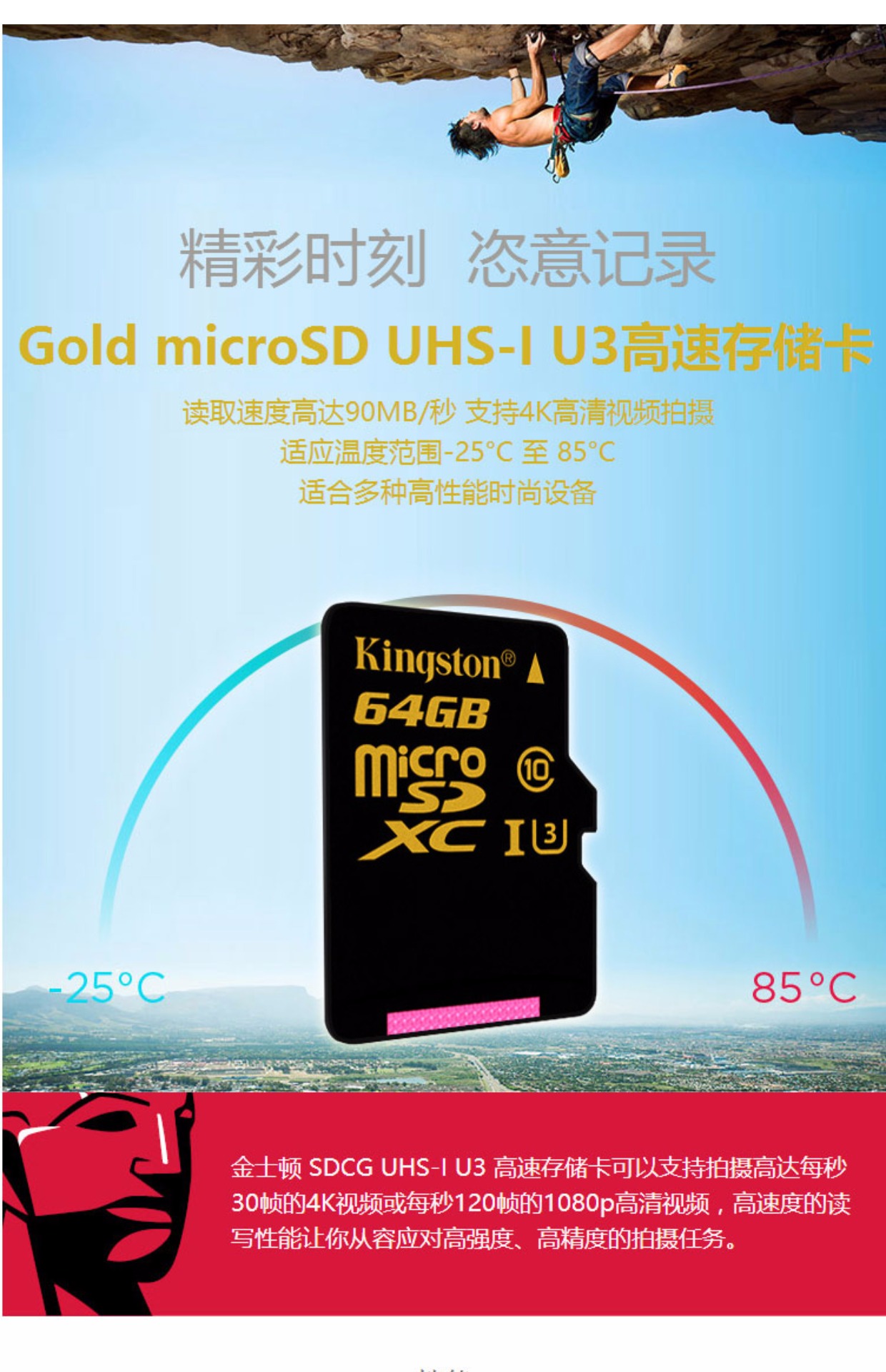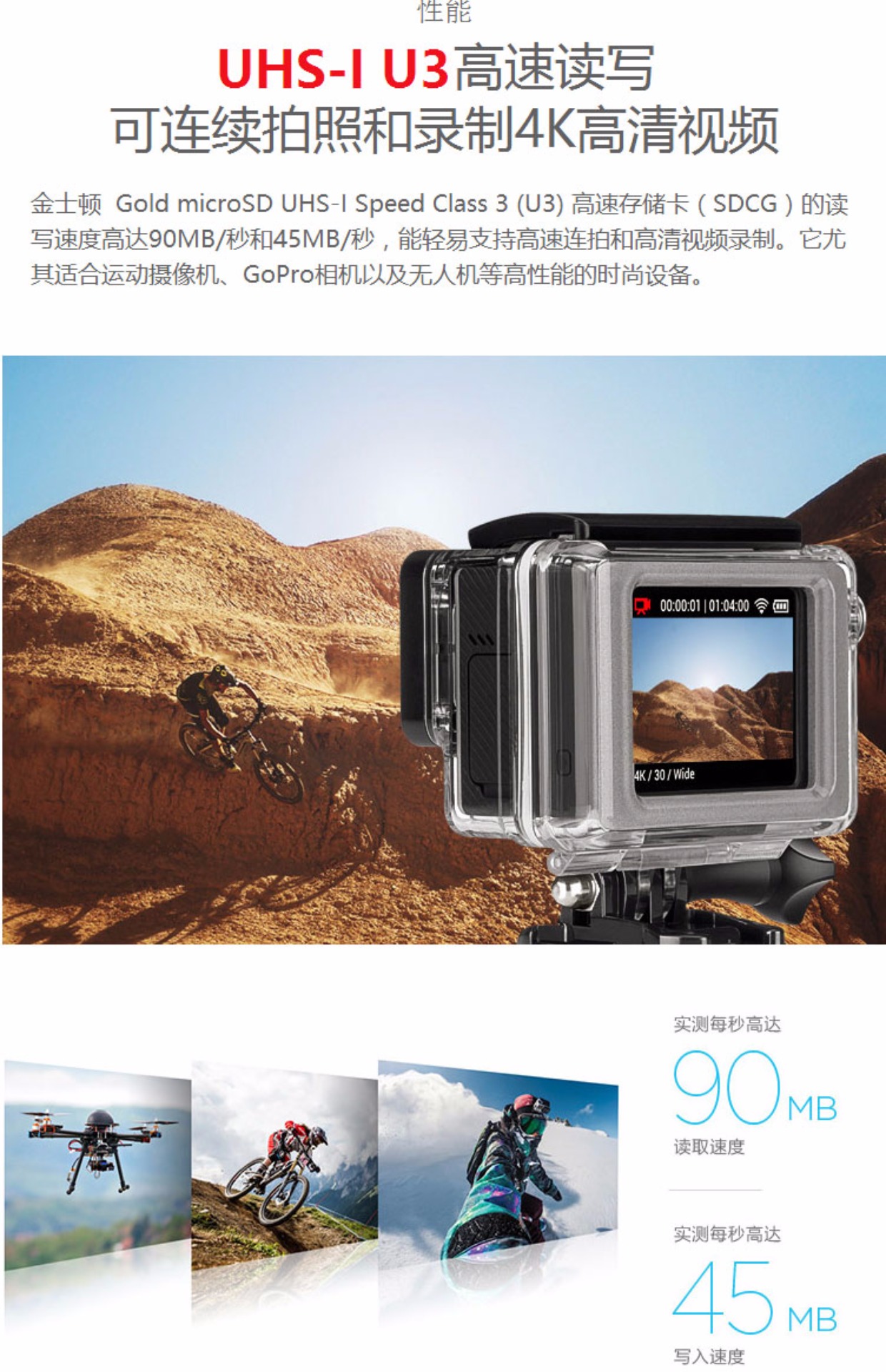 商品名称:金士顿 TF卡金色读90M支持4K视频U3运动无人机SDCG存储卡 64G