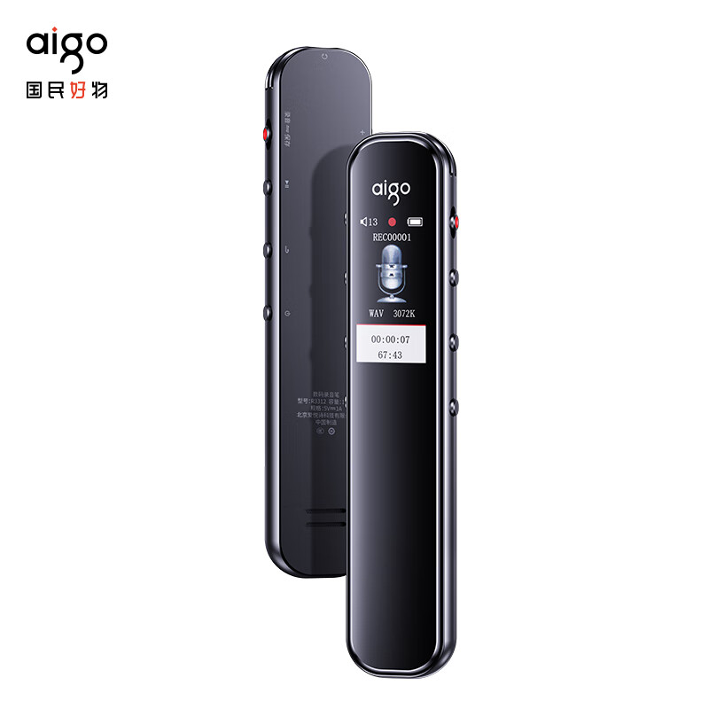 爱国者 aigo录音笔R3312 64G一键录音专业录音高清降噪 学习培训商务会议采访 录音器 MP3播放 灰色 单位:个