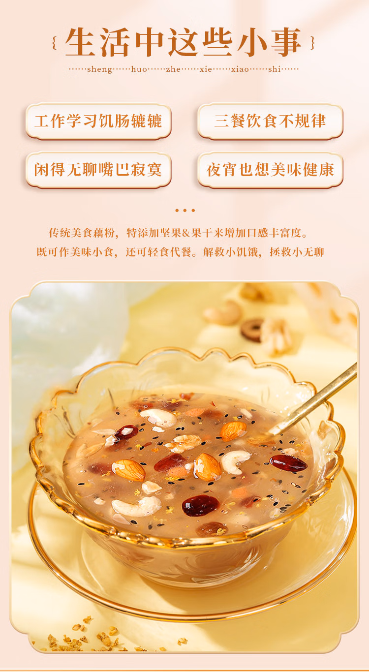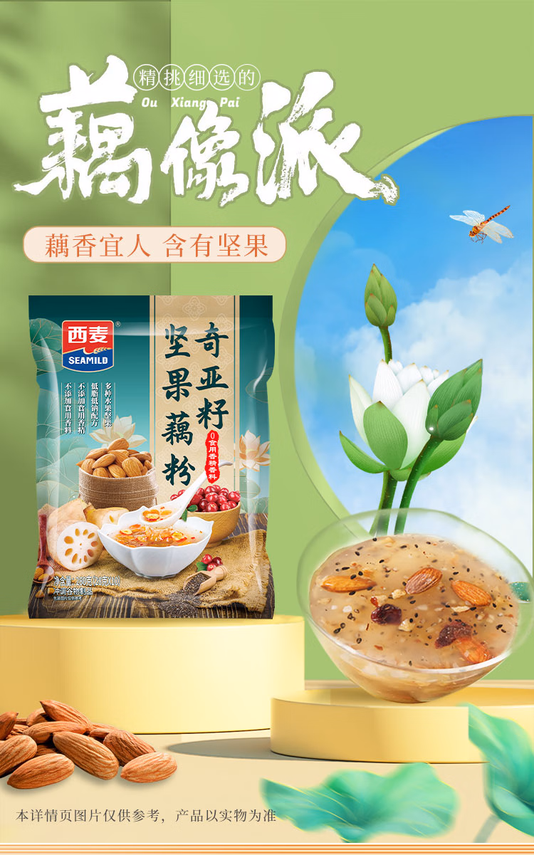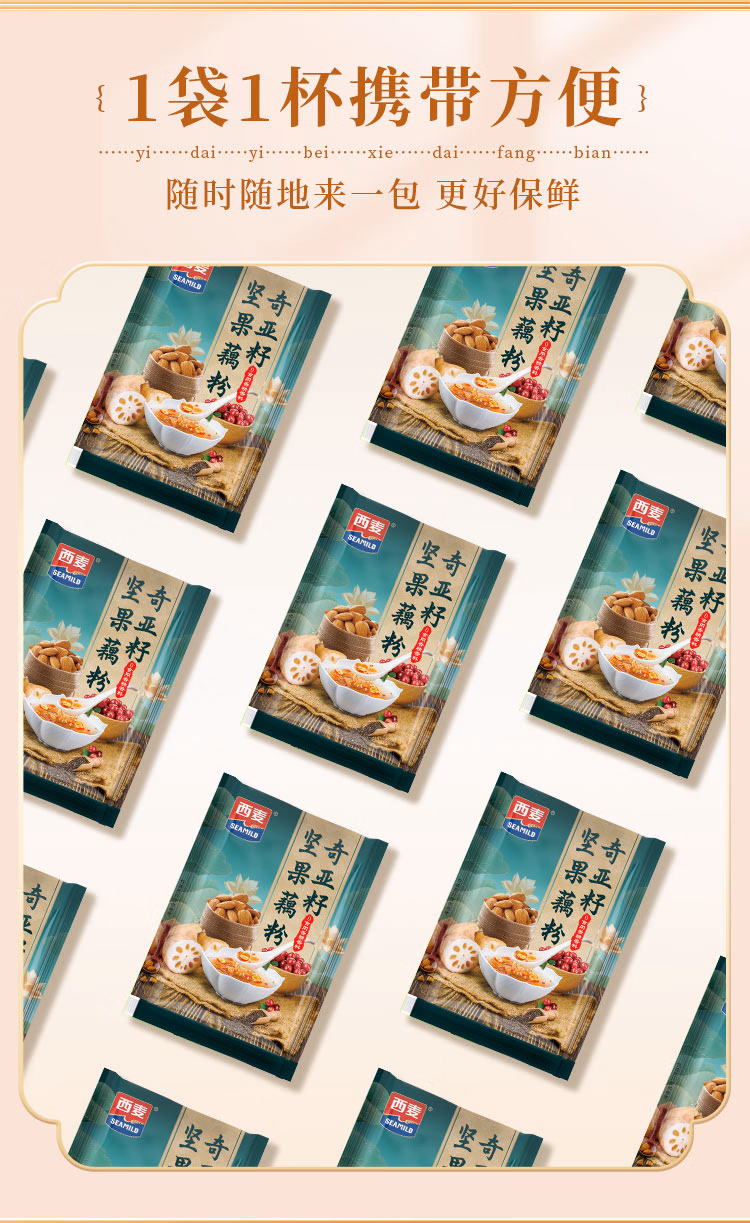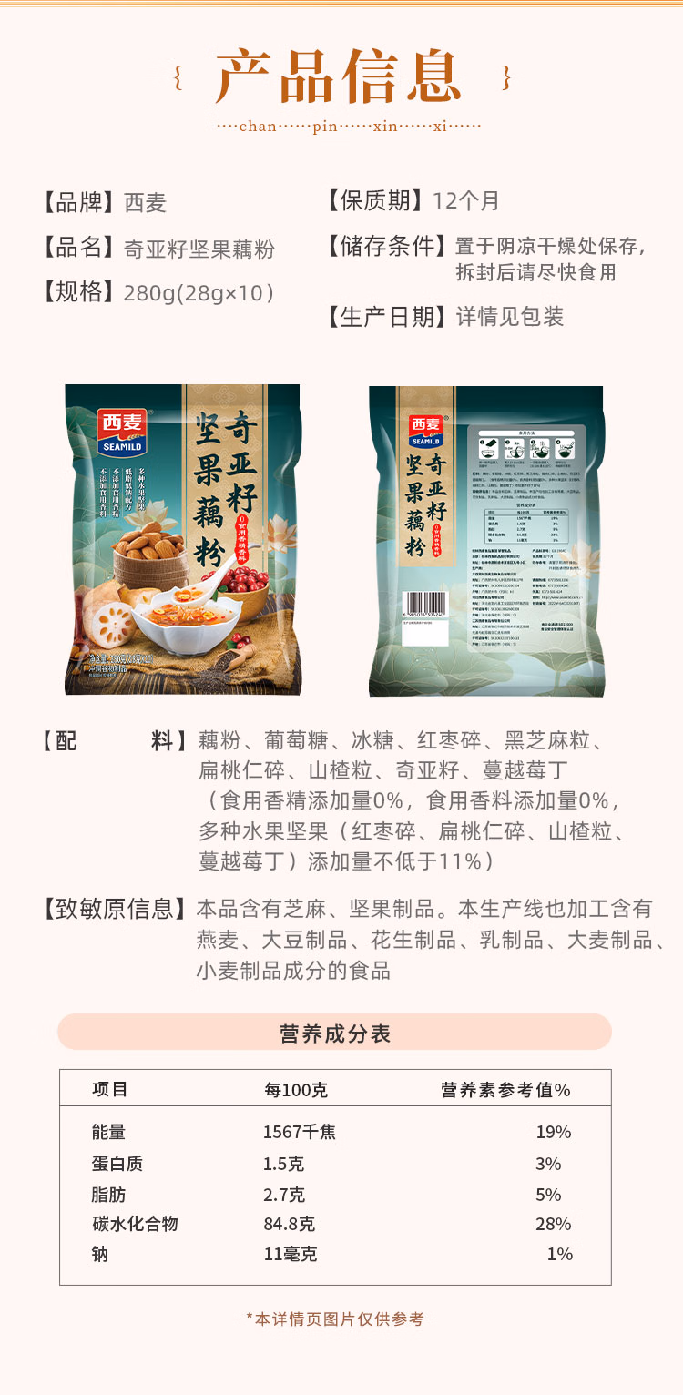 商品名称:西麦奇亚籽坚果藕粉280g 低脂速溶营养早餐羹方便速食代餐独立包装 单位:袋