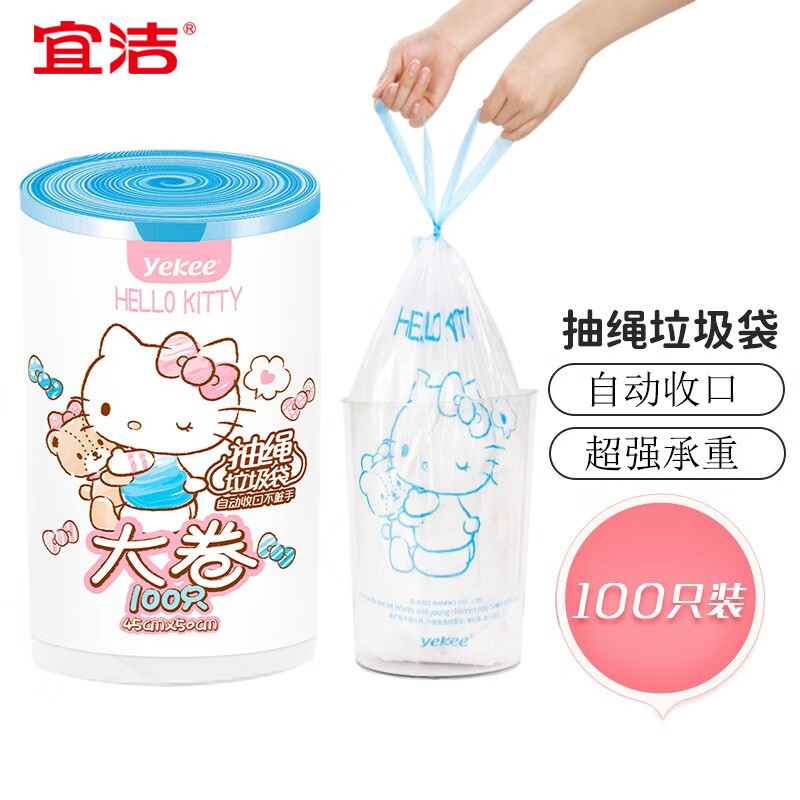 商品名称:宜洁(yekee)HelloKitty联名抽绳垃圾袋家用加厚清洁袋收口大卷*100只KT-8172 单位:卷