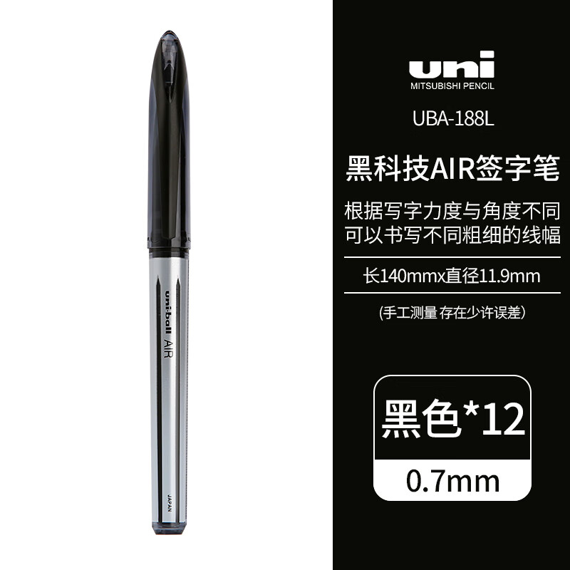 商品名称:三菱(Uni)黑科技AIR签字中性笔uni-ball漫画笔草图笔绘图笔UBA-188L黑色0.7mm 12支装 单位:盒