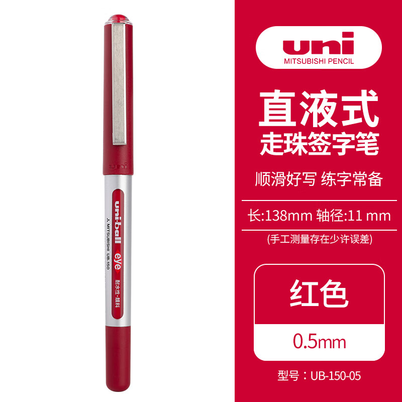 商品名称:三菱(Uni)UB-150中性笔直液式走珠笔签字笔 0.5mm耐水考试财务用笔 红色 单支装 单位:支